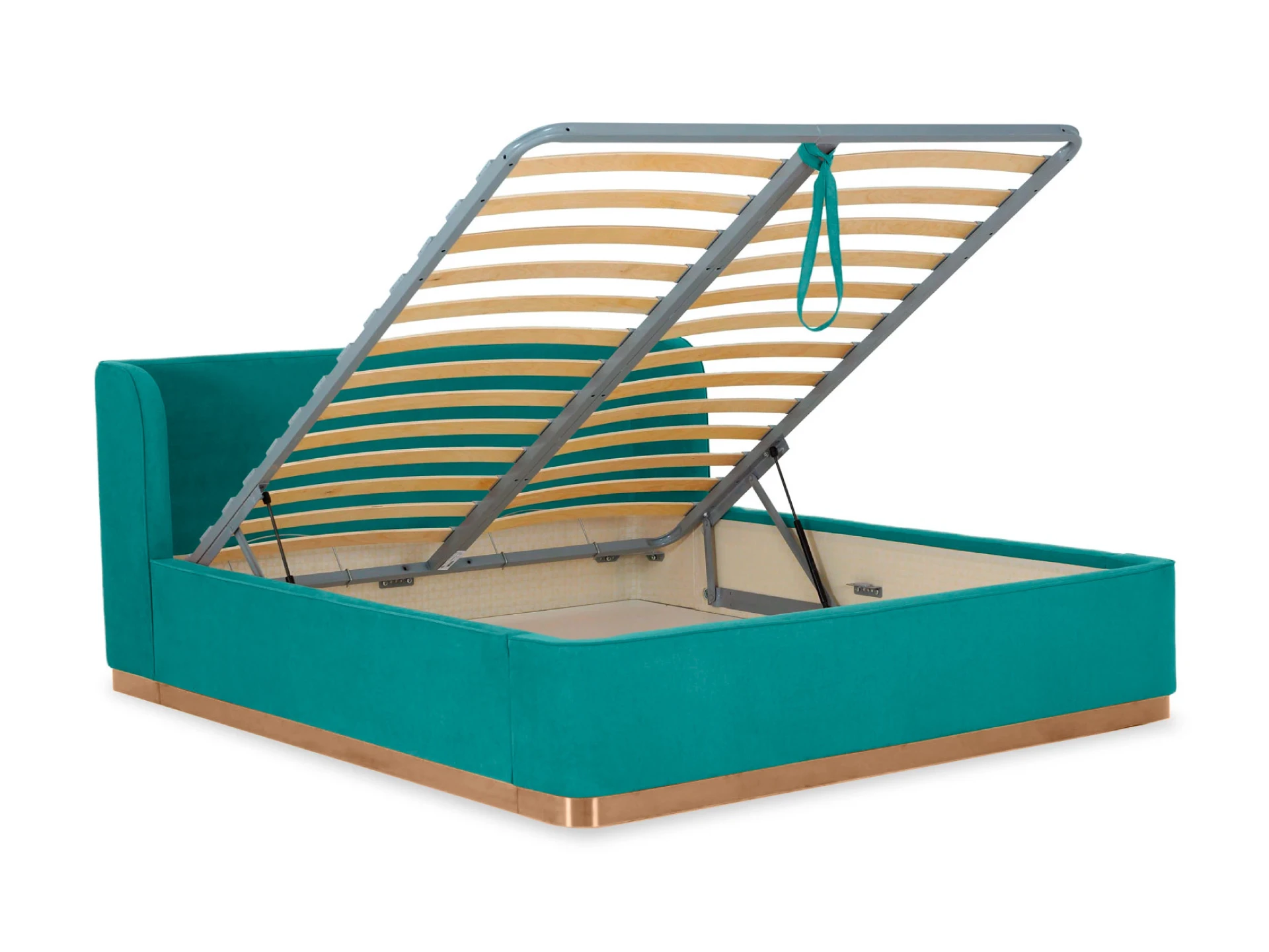 Кровать оснащена металлическим подъемным основанием с гибкими ламелями, под которым находится внутреннее отделение, предназначенное для хранения белья или других предметов. Спинка и царги кровати выполнены из плиты ЛДСтП т.22мм, брусков и березовой фанеры. Настилы из пенополиуретана и синтепона. Подиум сделан из плиты МДФ и брусков. Нижнюю часть подиума украшает металлическая лента из нержавеющей стали с покрытием «матовое золото». Дно бельевого ящика: плита ЛДСтП т.16мм «Белая Гладкая».