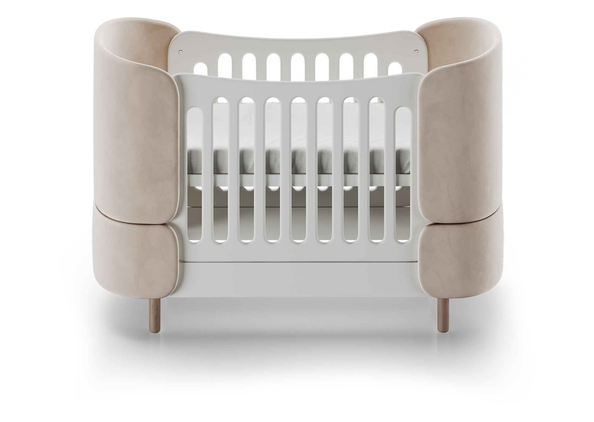 Кроватка-трансформер KIDI Soft с мягкими текстильными спинками имеет увеличенный размер спального места, что позволяет использовать кроватку даже в базовой комплектации до 4 лет