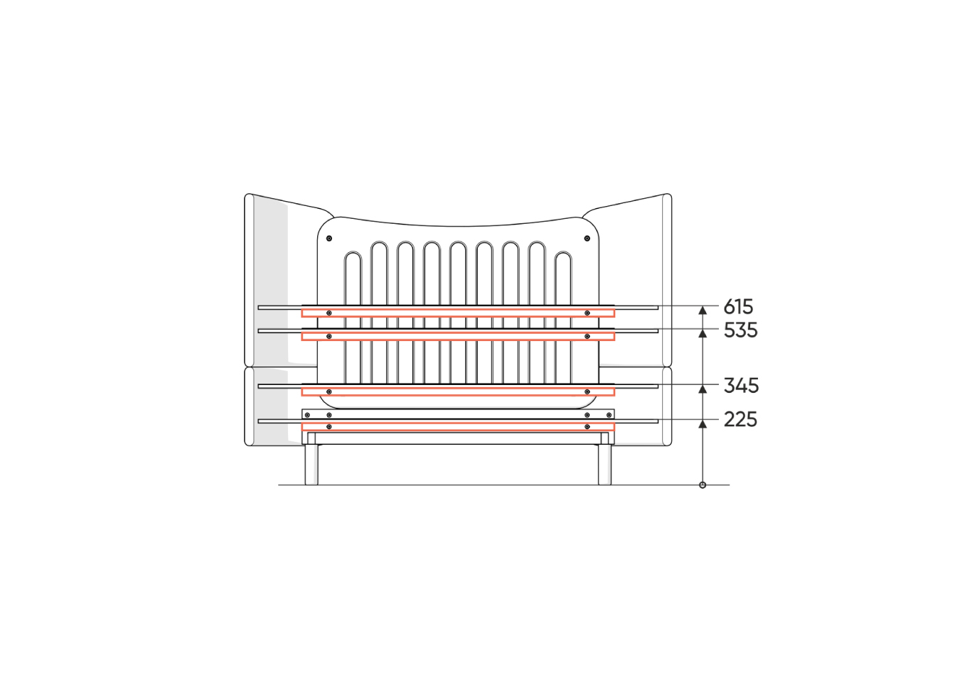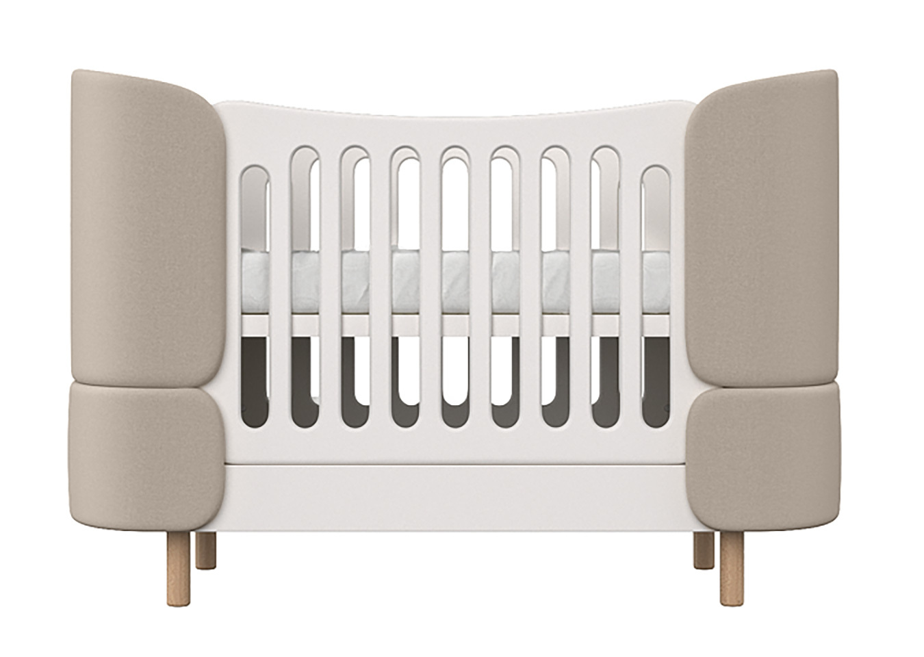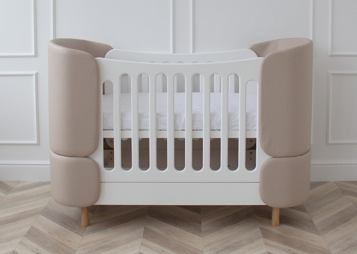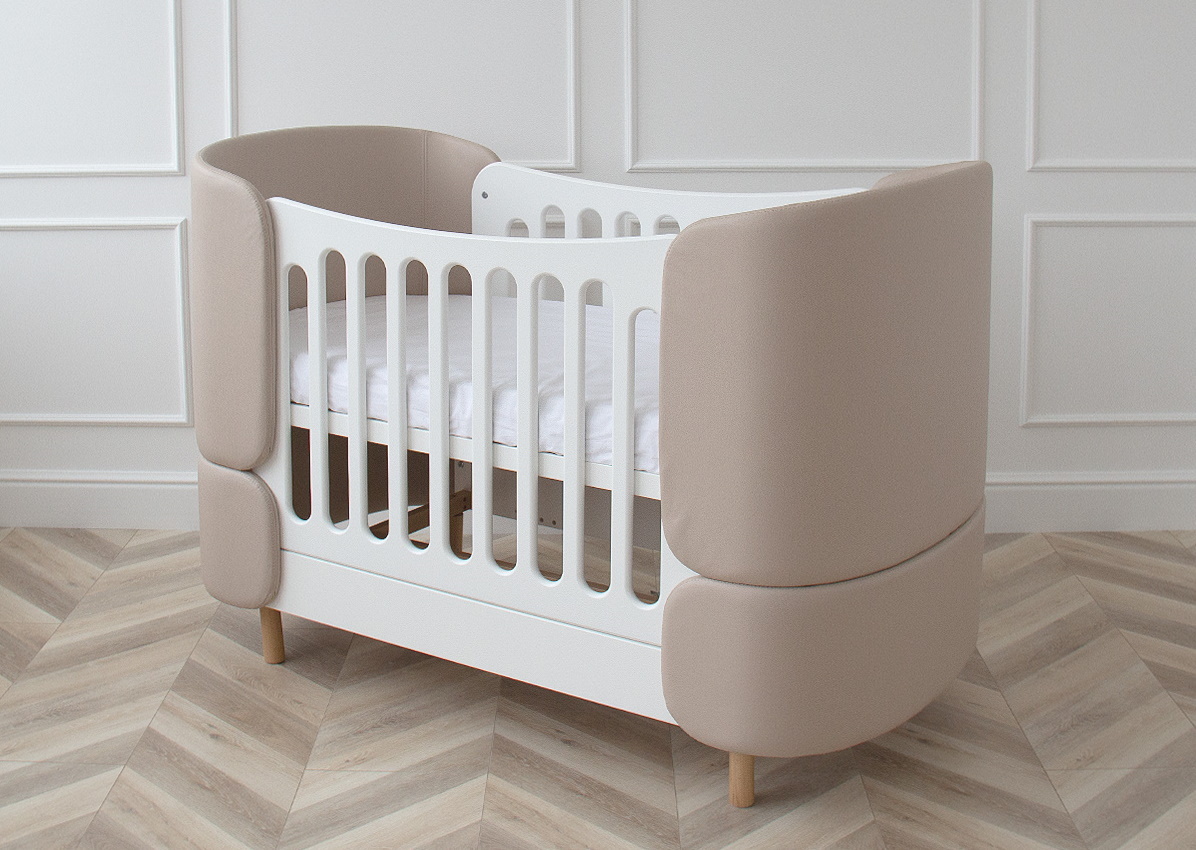 Кроватка-трансформер KIDI Soft с мягкими спинками из экокожи имеет увеличенный размер спального места, что позволяет использовать кроватку даже в базовой комплектации до 4 лет