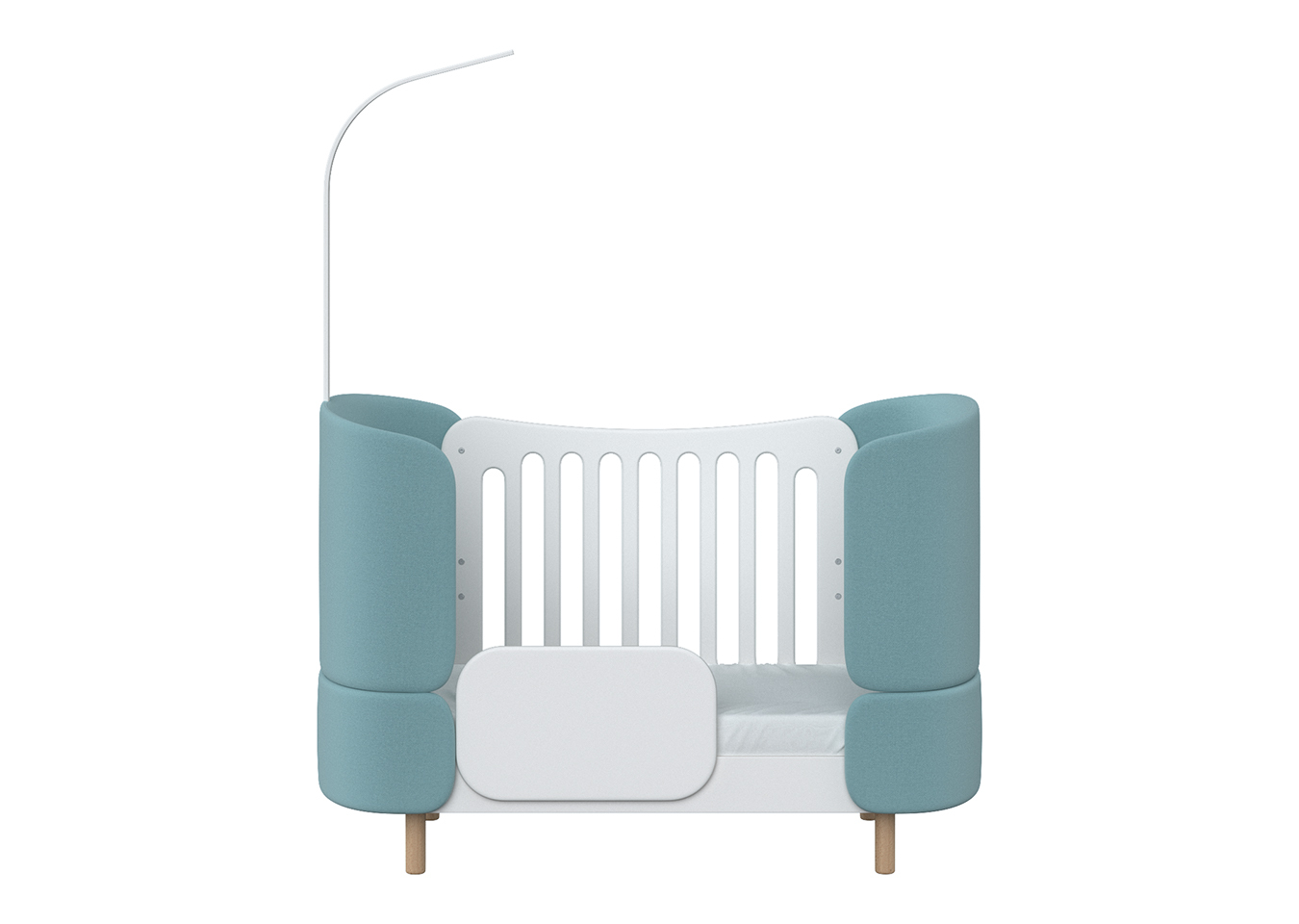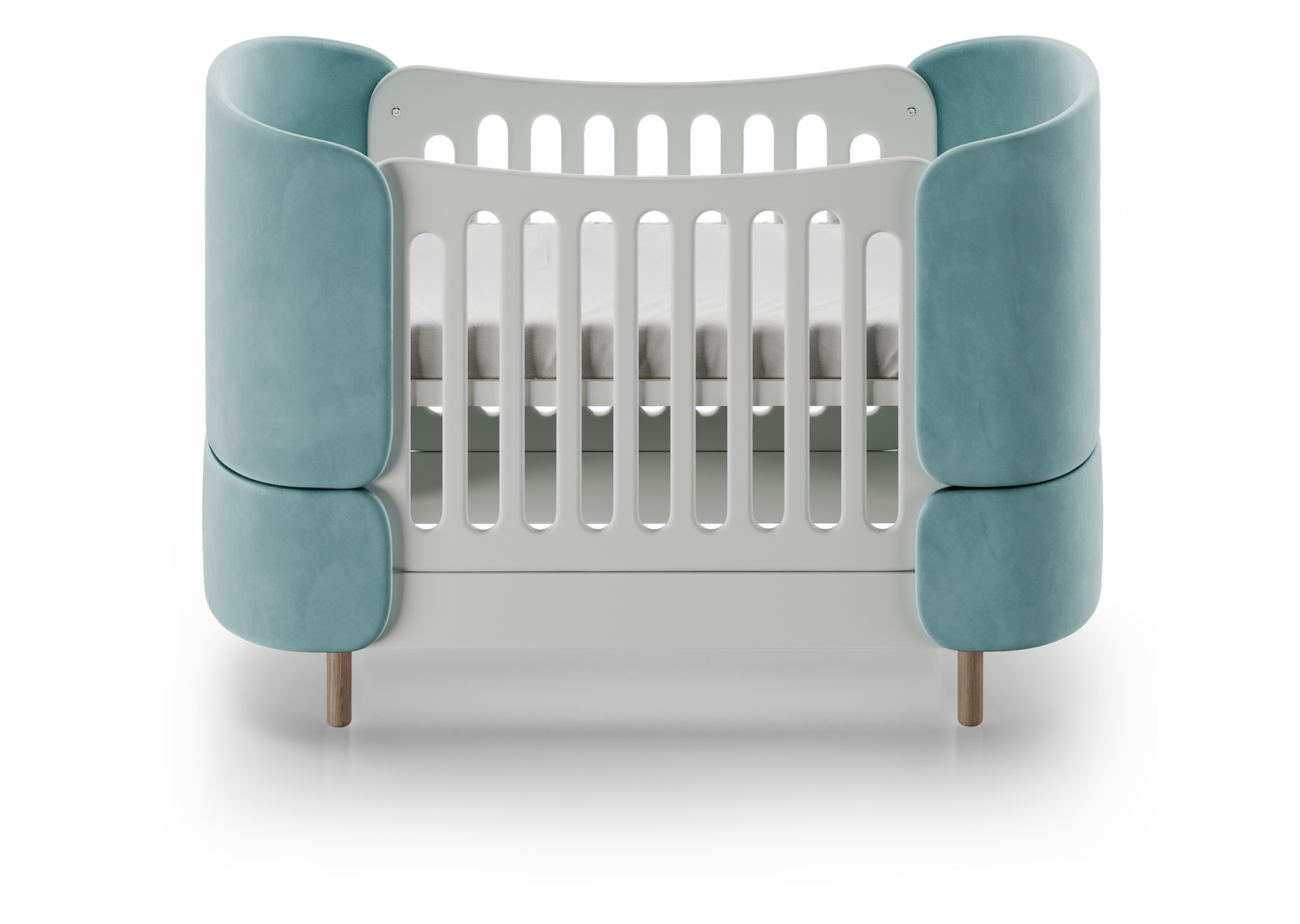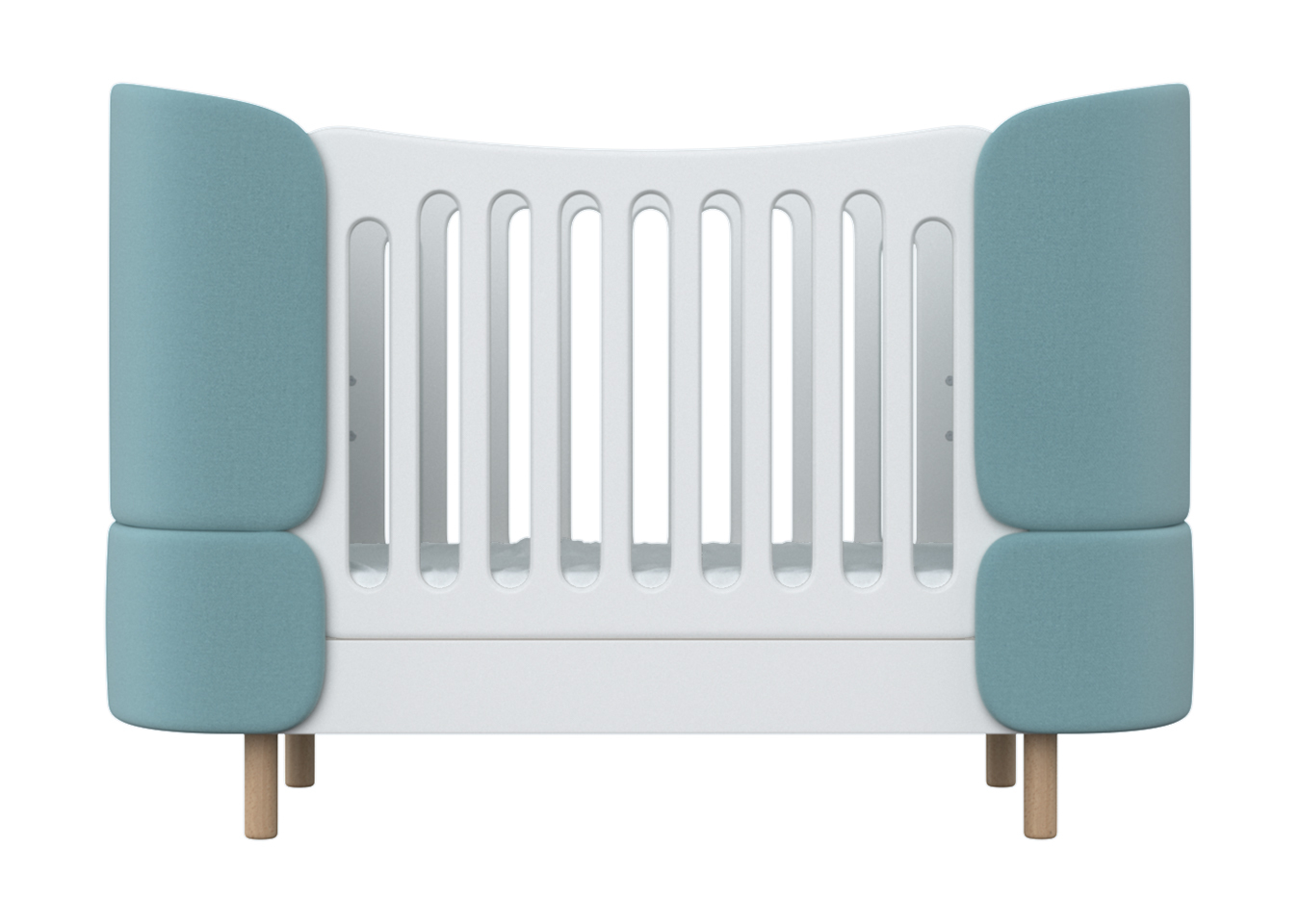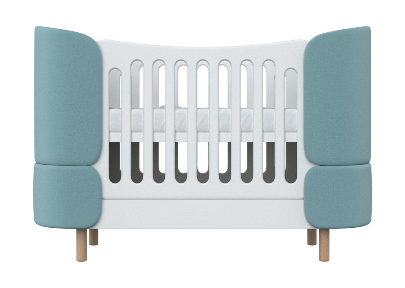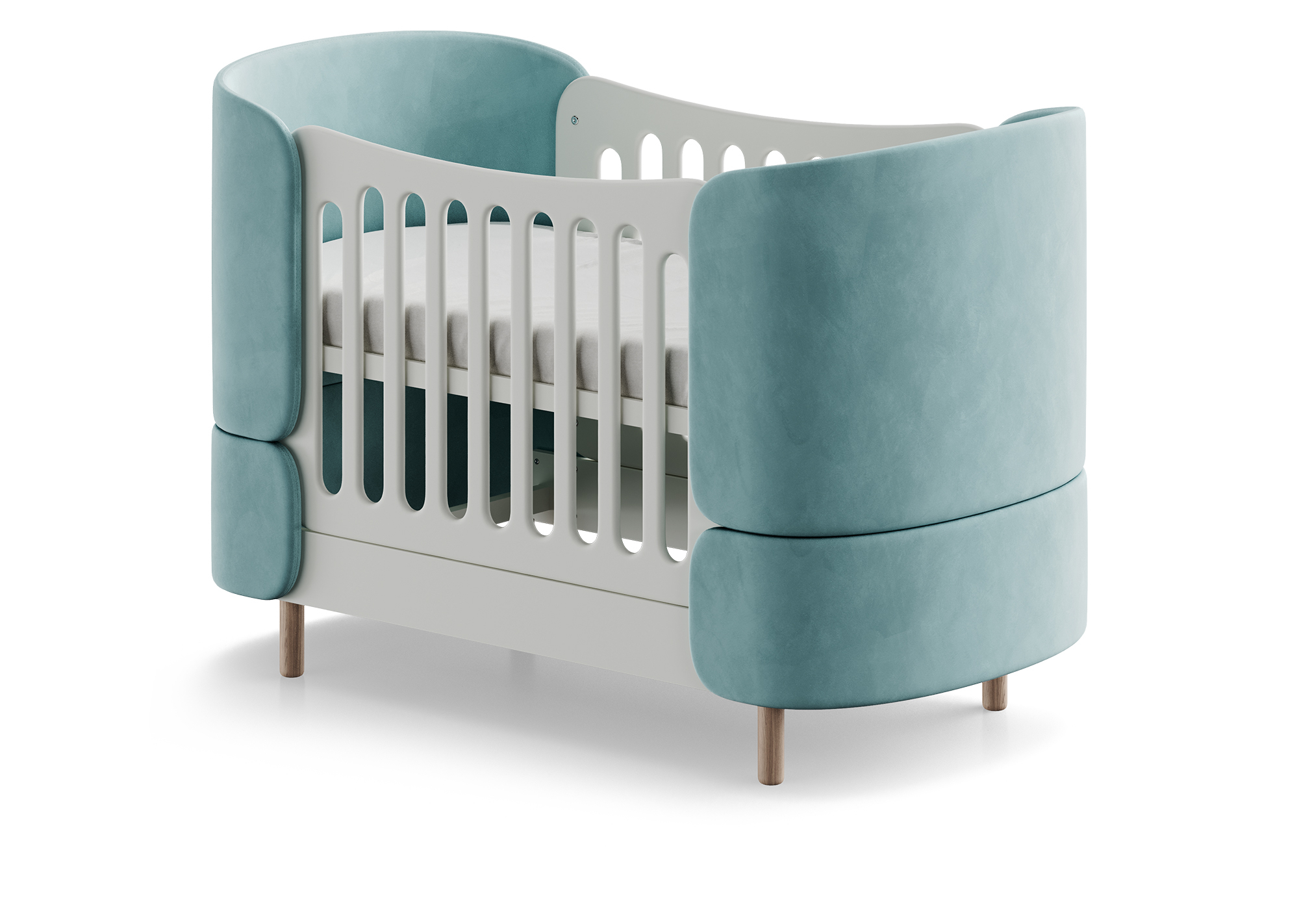 Кроватка-трансформер KIDI Soft с мягкими текстильными спинками имеет увеличенный размер спального места, что позволяет использовать кроватку даже в базовой комплектации до 4 лет
