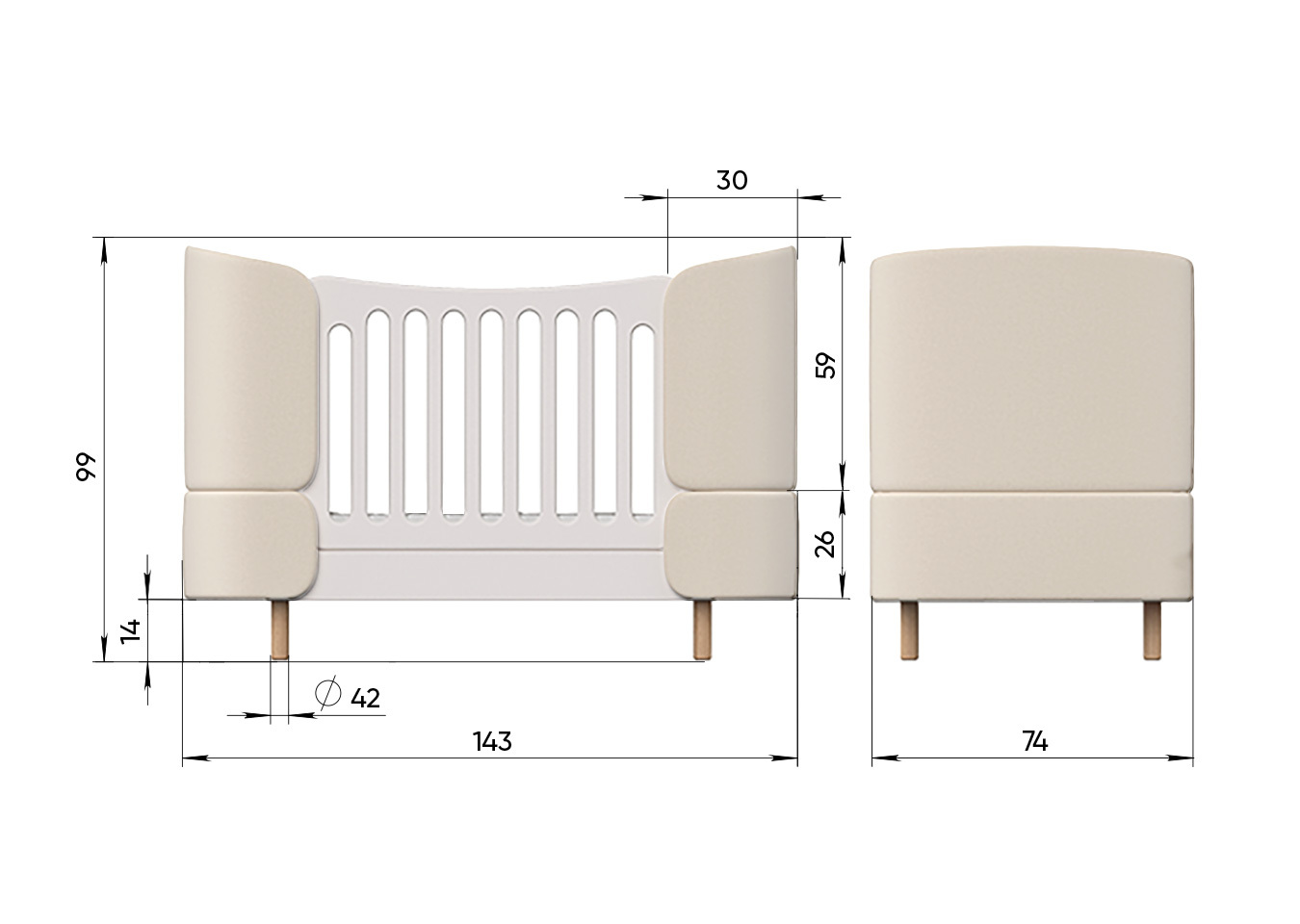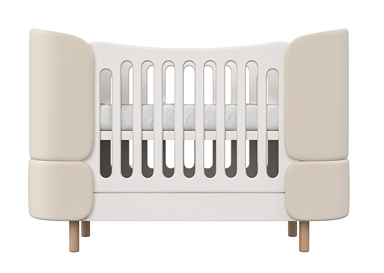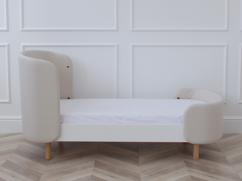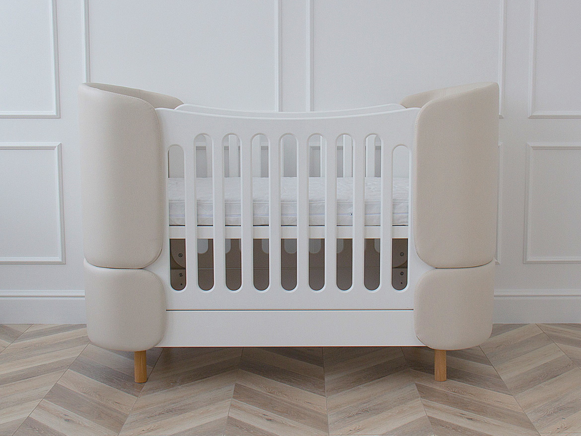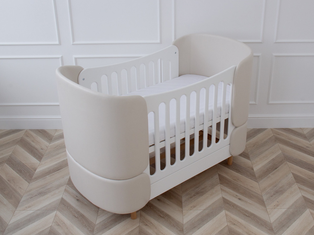 Кроватка-трансформер KIDI Soft с мягкими спинками из экокожи имеет увеличенный размер спального места, что позволяет использовать кроватку даже в базовой комплектации до 4 лет