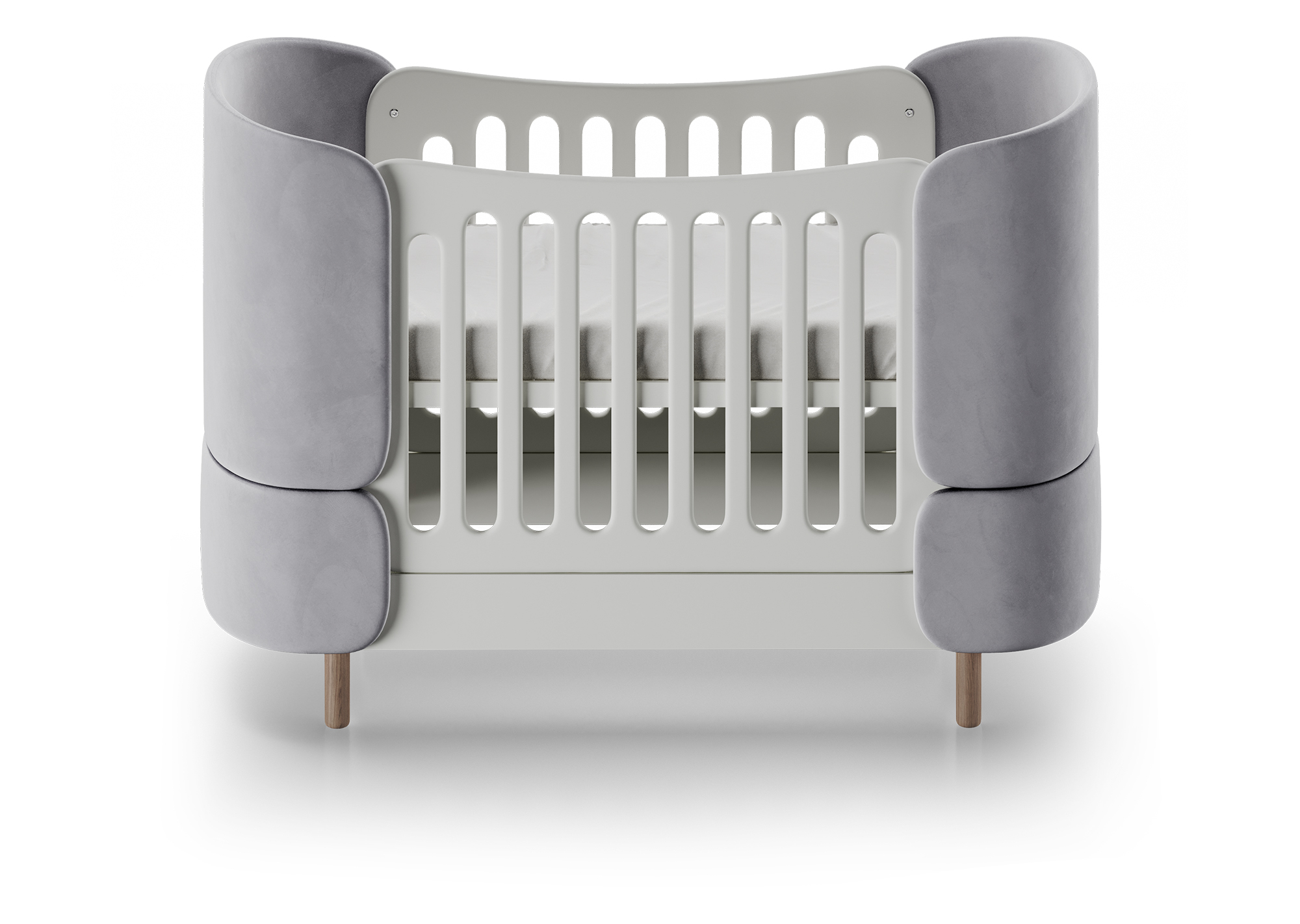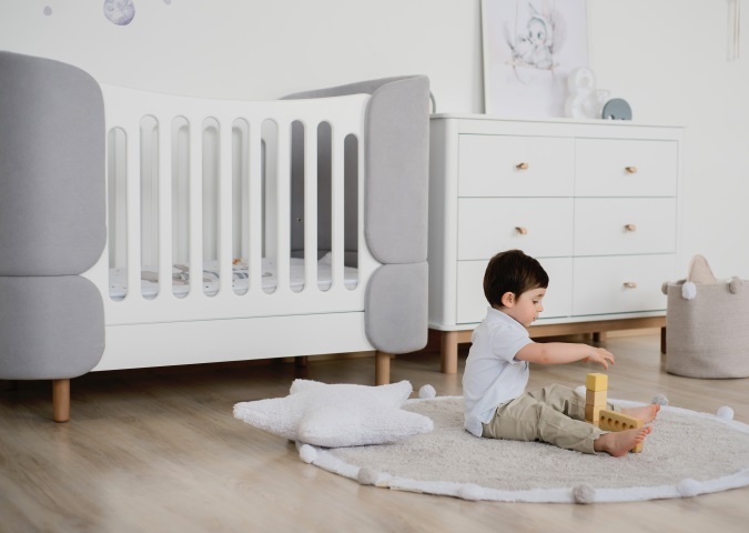 Кроватка-трансформер KIDI Soft с мягкими текстильными спинками имеет увеличенный размер спального места, что позволяет использовать кроватку даже в базовой комплектации до 4 лет