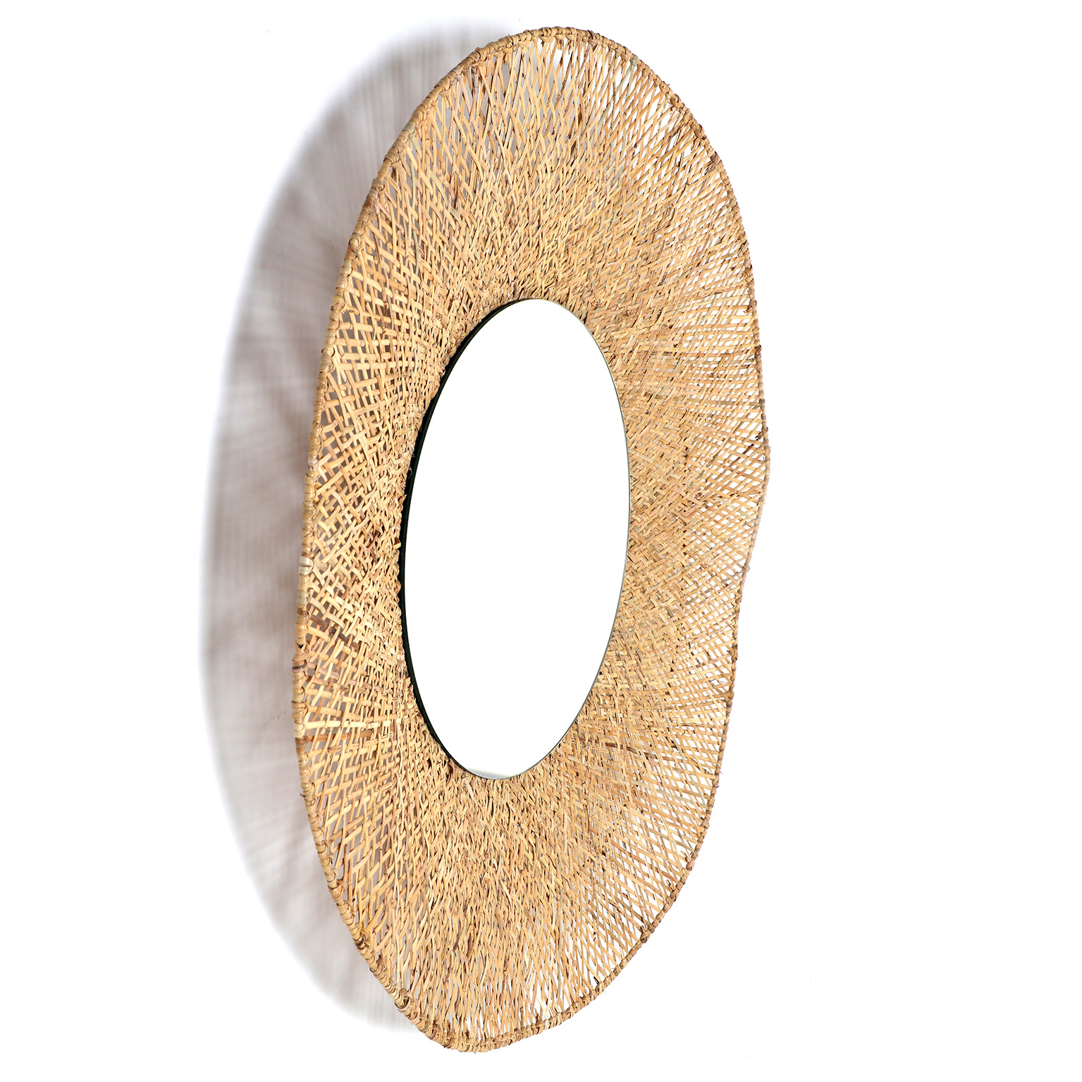 Круглое зеркало коричневого цвета в современном стиле. Изготовлен из ротанга, в сочетании с зеркалом.