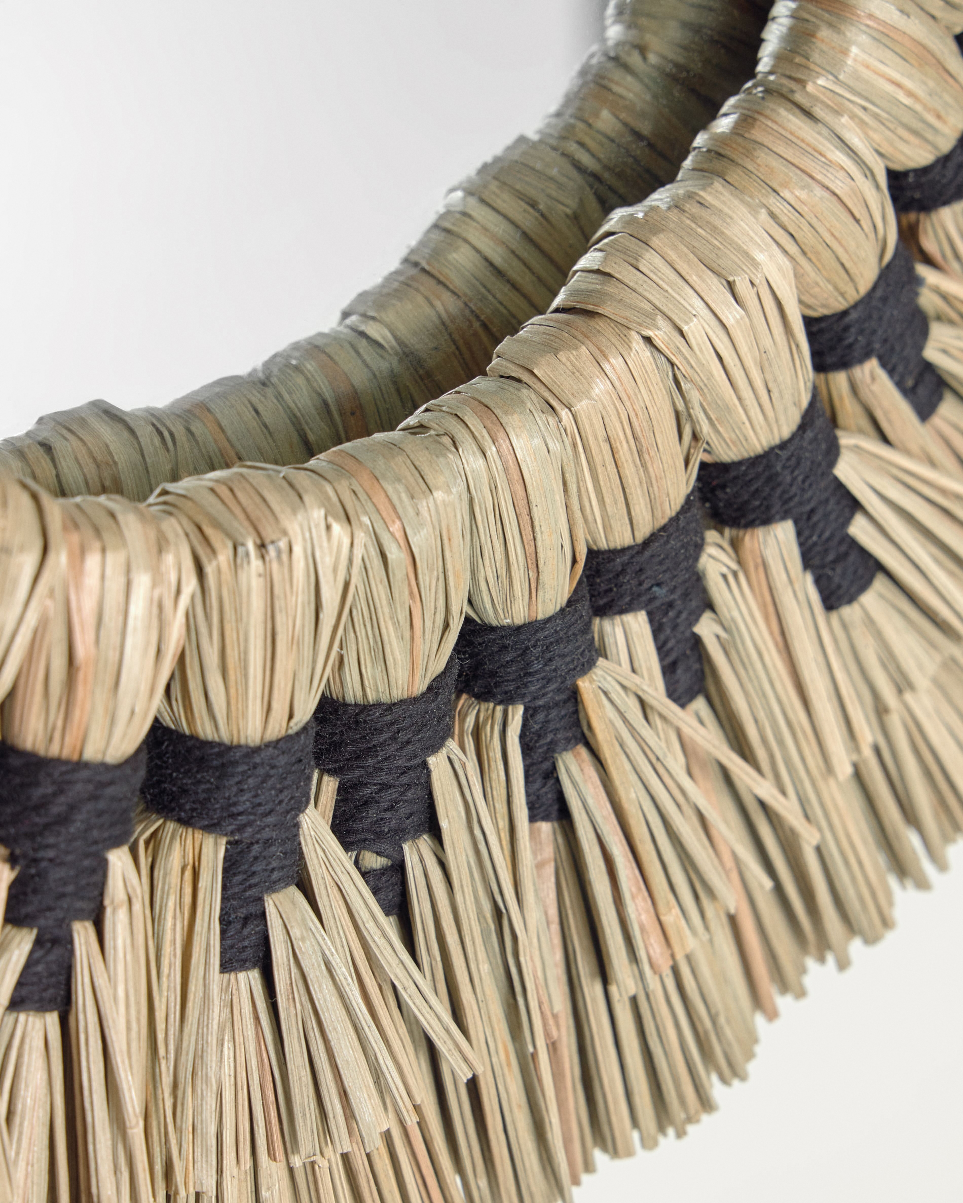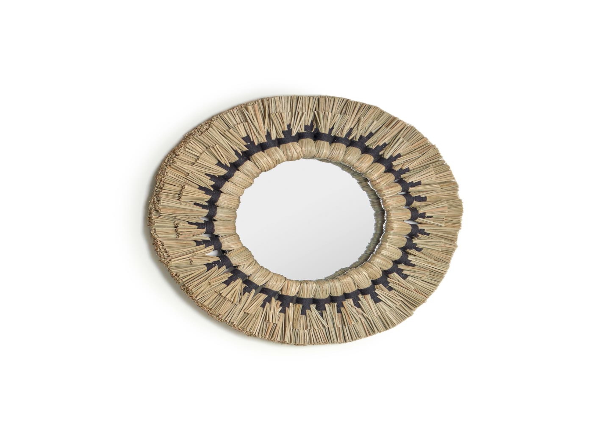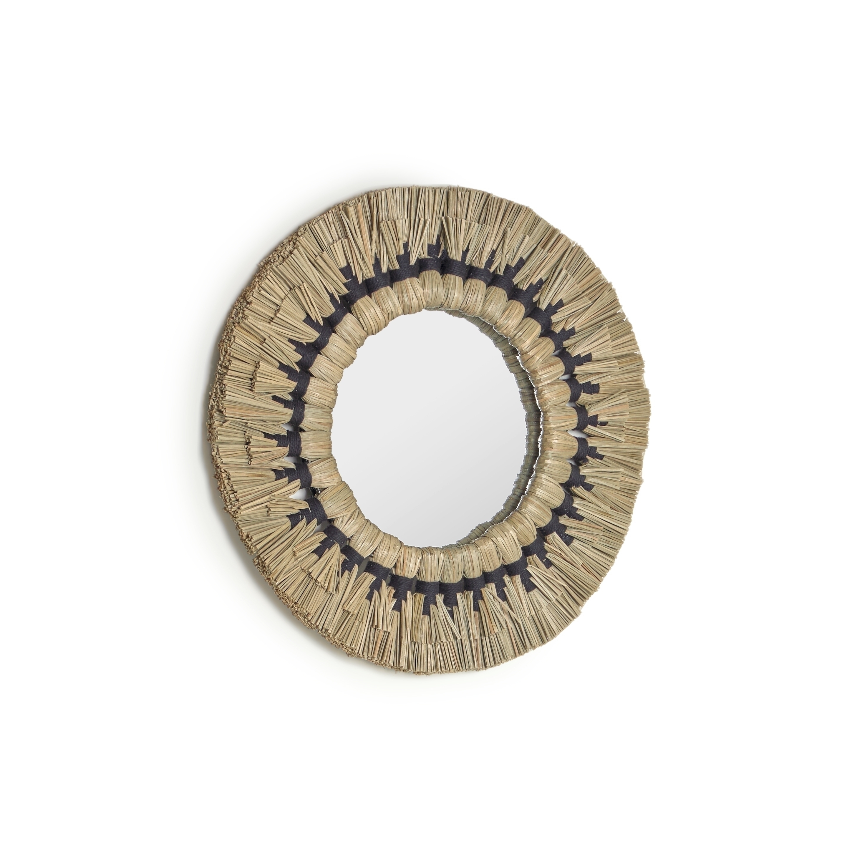 Круглое зеркало с рамкой ручной работы из хлопка и полосок мендонга - натурального волокна, сотканного вручную.