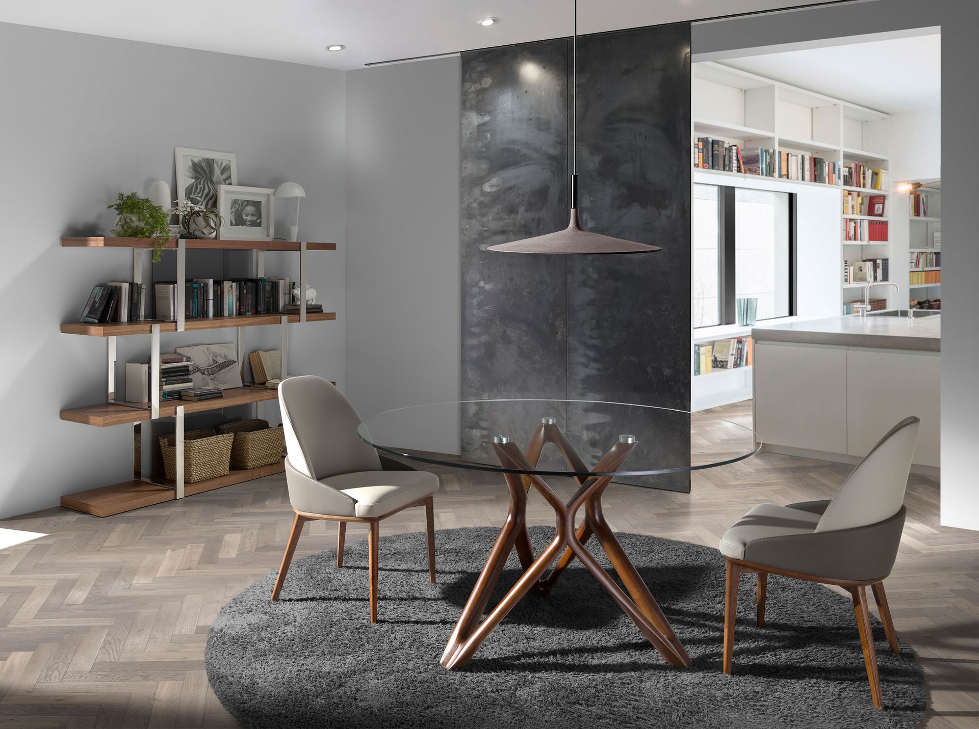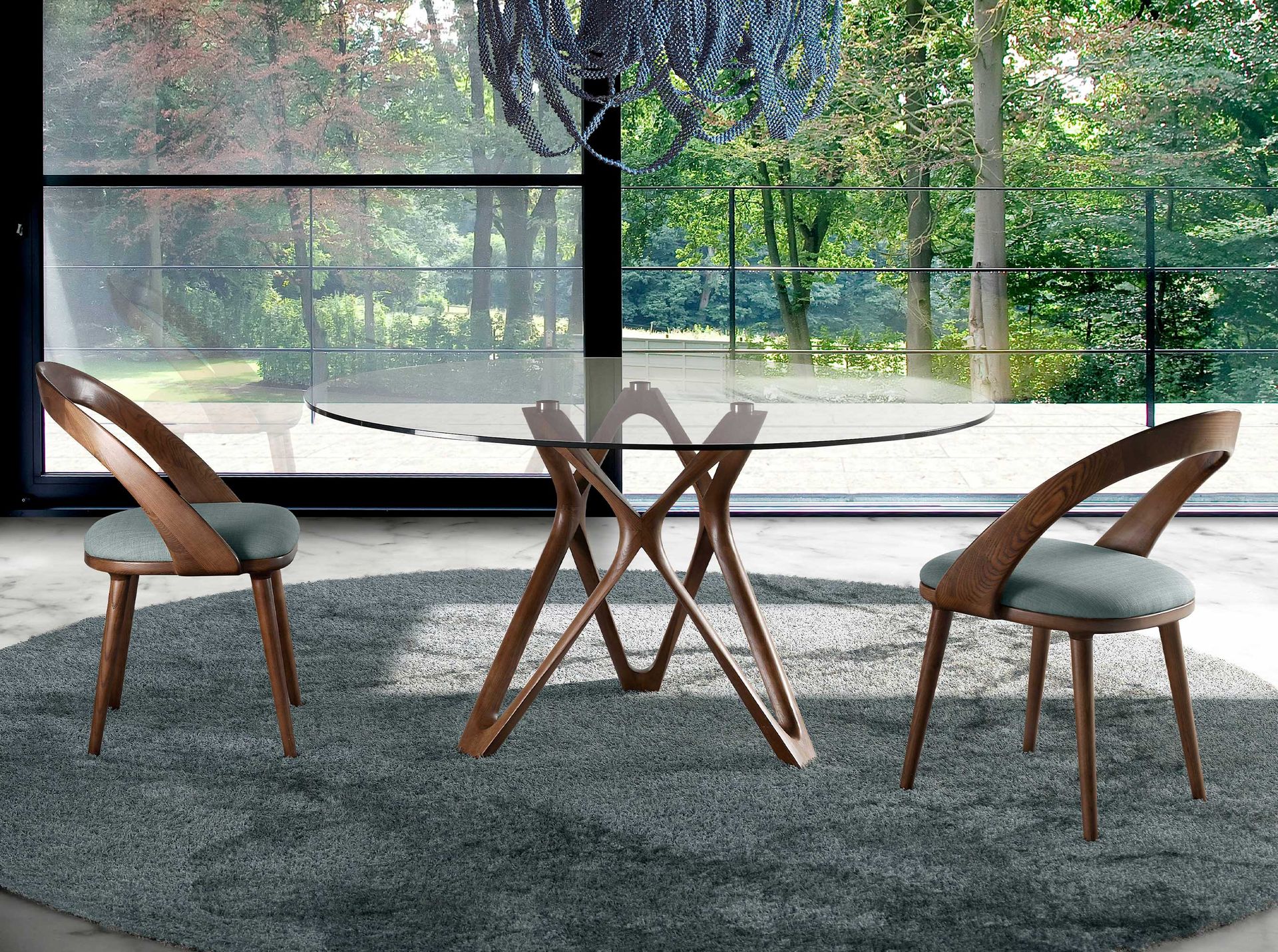 Круглый обеденный стол с столешницей из закаленного стекла. Структура ног из массива ясеня, ореховый цвет.