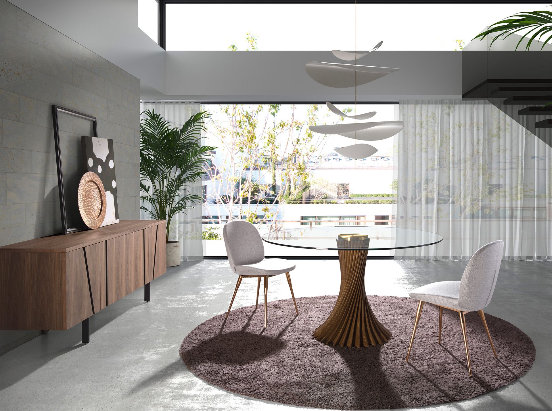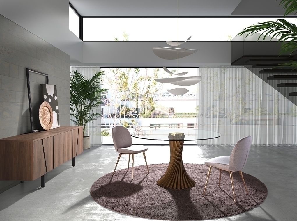 Круглый обеденный стол современного дизайна с фиксированной столешницей из закаленного стекла. Ключевым элементом дизайна являются оригинальные деревянные ножки из натурального шпона ореха.