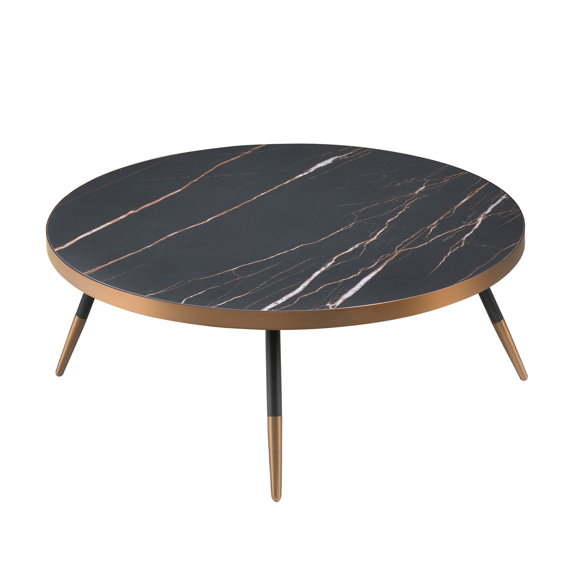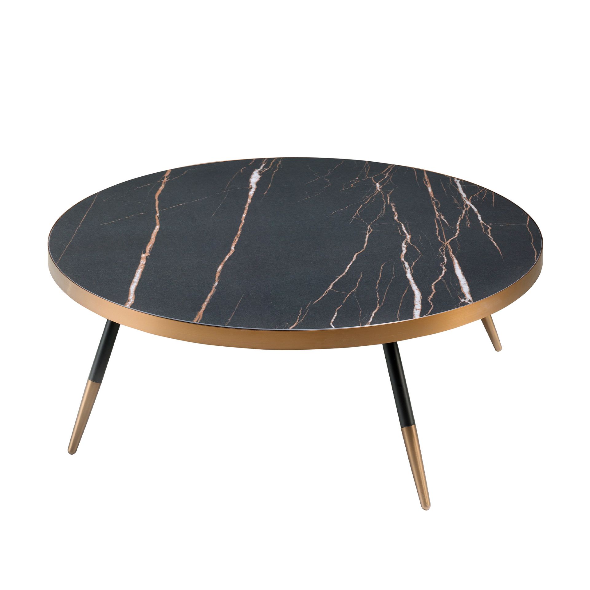 Круглый журнальный столик современного дизайна с керамической столешницей с имитацией черного мрамора и металлическими ножками. Этот оригинальный приставной столик в элегантном и изысканном стиле идеально подходит для привнесения тепла и стиля в вашу гостиную, а также для придания уникального акцента благодаря отделке его краев и ножек из стали под бронзу.