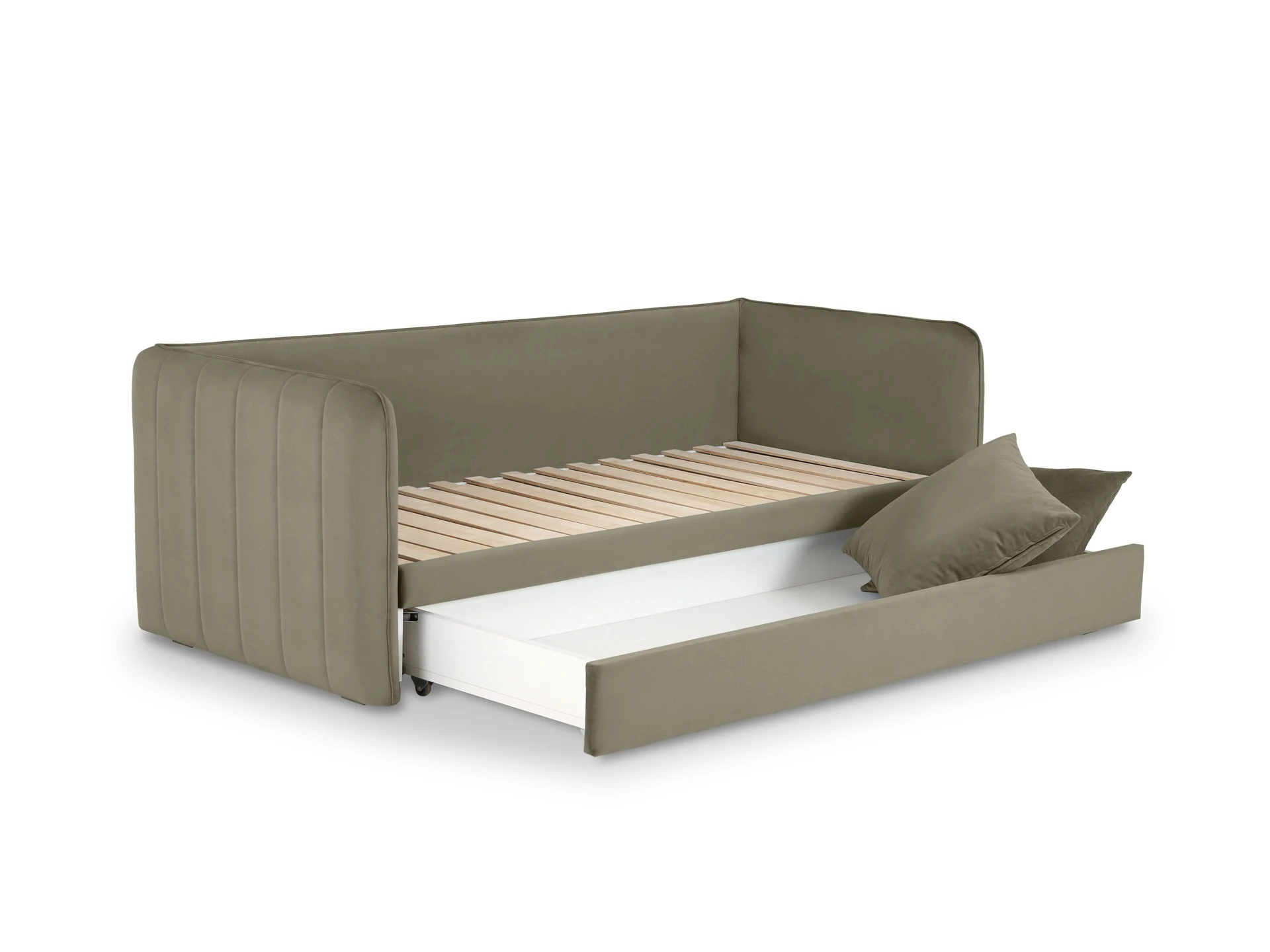 Todi — функциональная кушетка-кровать с двумя опциональными модулями. В собранном виде — это компактный диван, а в разложенном — спальное место размером 2000х1590х100 мм. Механизм трансформации — выкатной: при раскладывании достаточно выкатить вспомогательную секцию из-под сиденья и установить на нее блок ламелей. Конструкция проста и надежна для ежедневного использования. Также есть второй выкатной модуль, который можно использовать в качестве емкости для хранения или дополнительного спального места. Кушетка Todi — идеальный выбор для пространств средних и компактных размеров. Она гармонично впишется в гостиную, детскую, спальню, кухню. Каркас из деревянного бруса, в основе — породы хвойных: ель и сосна, влагостойкая березовая фанера. Мебель из этих материалов экологична, надежна и долговечна.