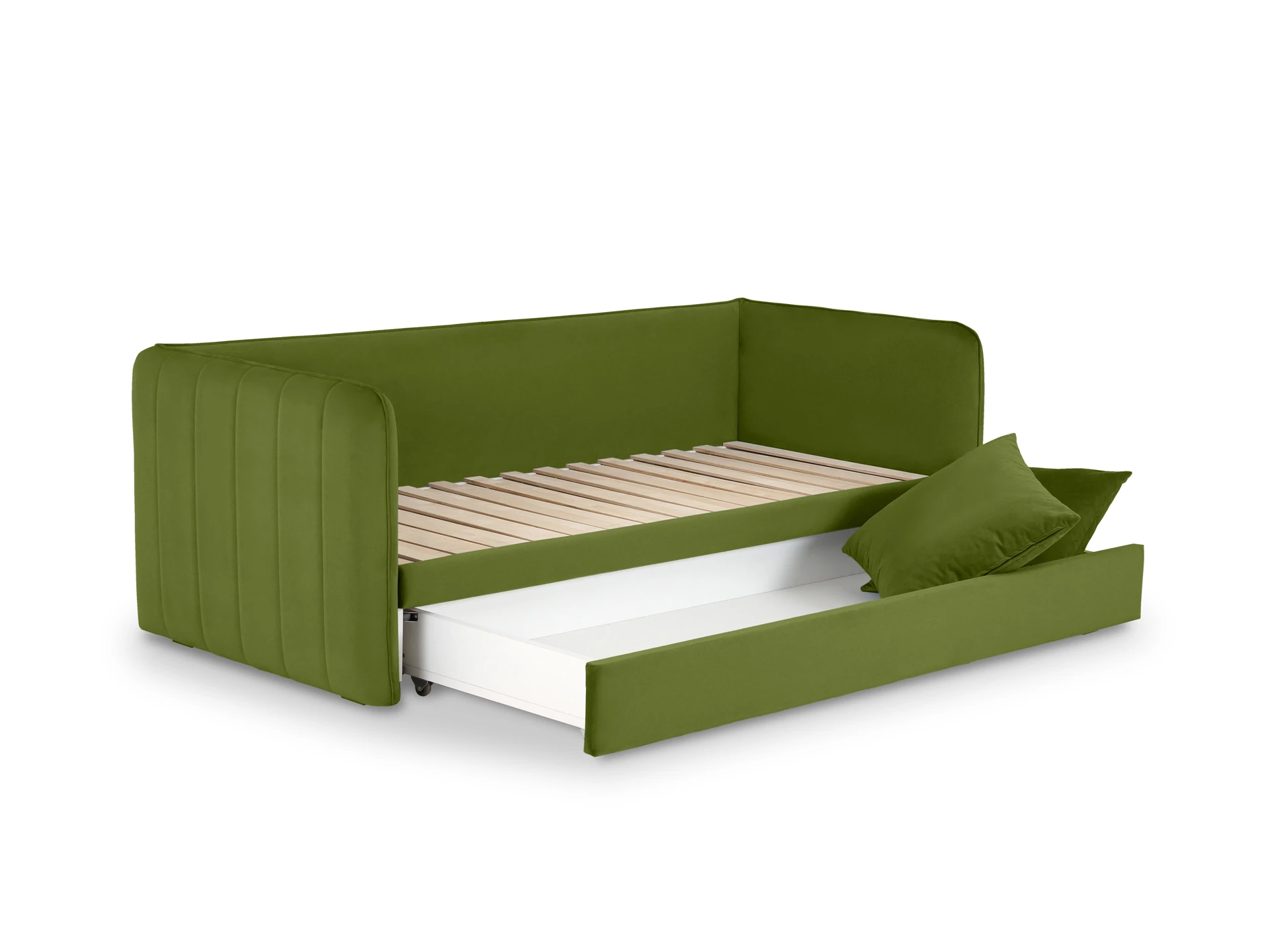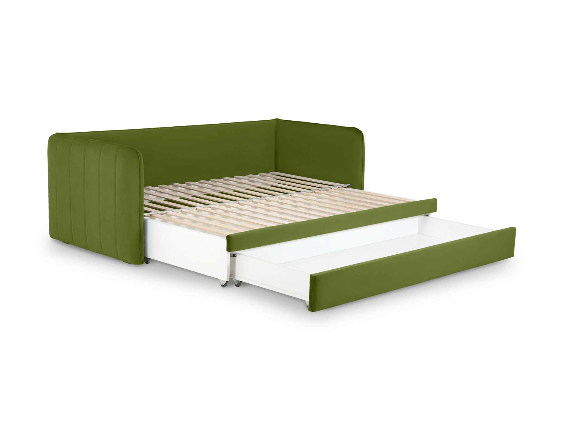 Todi — функциональная кушетка-кровать с двумя опциональными модулями. В собранном виде — это компактный диван, а в разложенном — спальное место размером 2000х1590х100 мм. Механизм трансформации — выкатной: при раскладывании достаточно выкатить вспомогательную секцию из-под сиденья и установить на нее блок ламелей. Конструкция проста и надежна для ежедневного использования. Также есть второй выкатной модуль, который можно использовать в качестве емкости для хранения или дополнительного спального места. Кушетка Todi — идеальный выбор для пространств средних и компактных размеров. Она гармонично впишется в гостиную, детскую, спальню, кухню. Каркас из деревянного бруса, в основе — породы хвойных: ель и сосна, влагостойкая березовая фанера. Мебель из этих материалов экологична, надежна и долговечна.