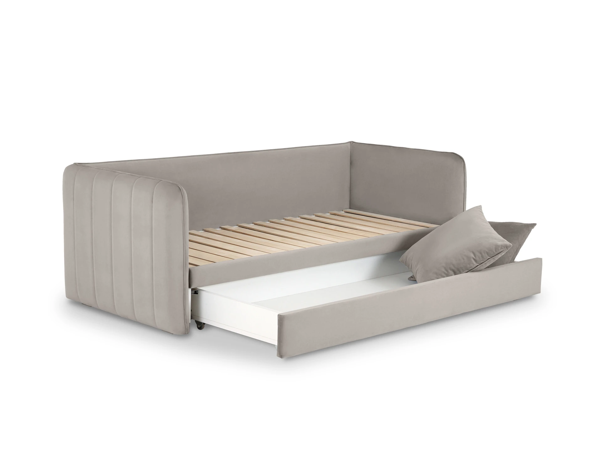 Todi — функциональная кушетка-кровать с двумя опциональными модулями. В собранном виде — это компактный диван, а в разложенном — спальное место размером 2000х1590х100 мм. Механизм трансформации — выкатной: при раскладывании достаточно выкатить вспомогательную секцию из-под сиденья и установить на нее блок ламелей. Конструкция проста и надежна для ежедневного использования. Также есть второй выкатной модуль, который можно использовать в качестве емкости для хранения или дополнительного спального места. Кушетка Todi — идеальный выбор для пространств средних и компактных размеров. Она гармонично впишется в гостиную, детскую, спальню, кухню. Каркас из деревянного бруса, в основе — породы хвойных: ель и сосна, влагостойкая березовая фанера. Мебель из этих материалов экологична, надежна и долговечна.