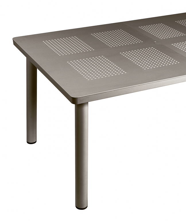 Раздвижной стол Libeccio станет превосходным решением для обустройства разнообразных открытых пространств. Столешница украшена интересным узором из маленьких отверстий, которые последовательно повторяются, а каркас изготовлен из легкого и прочного трубчатого алюминия с круглым сечением.