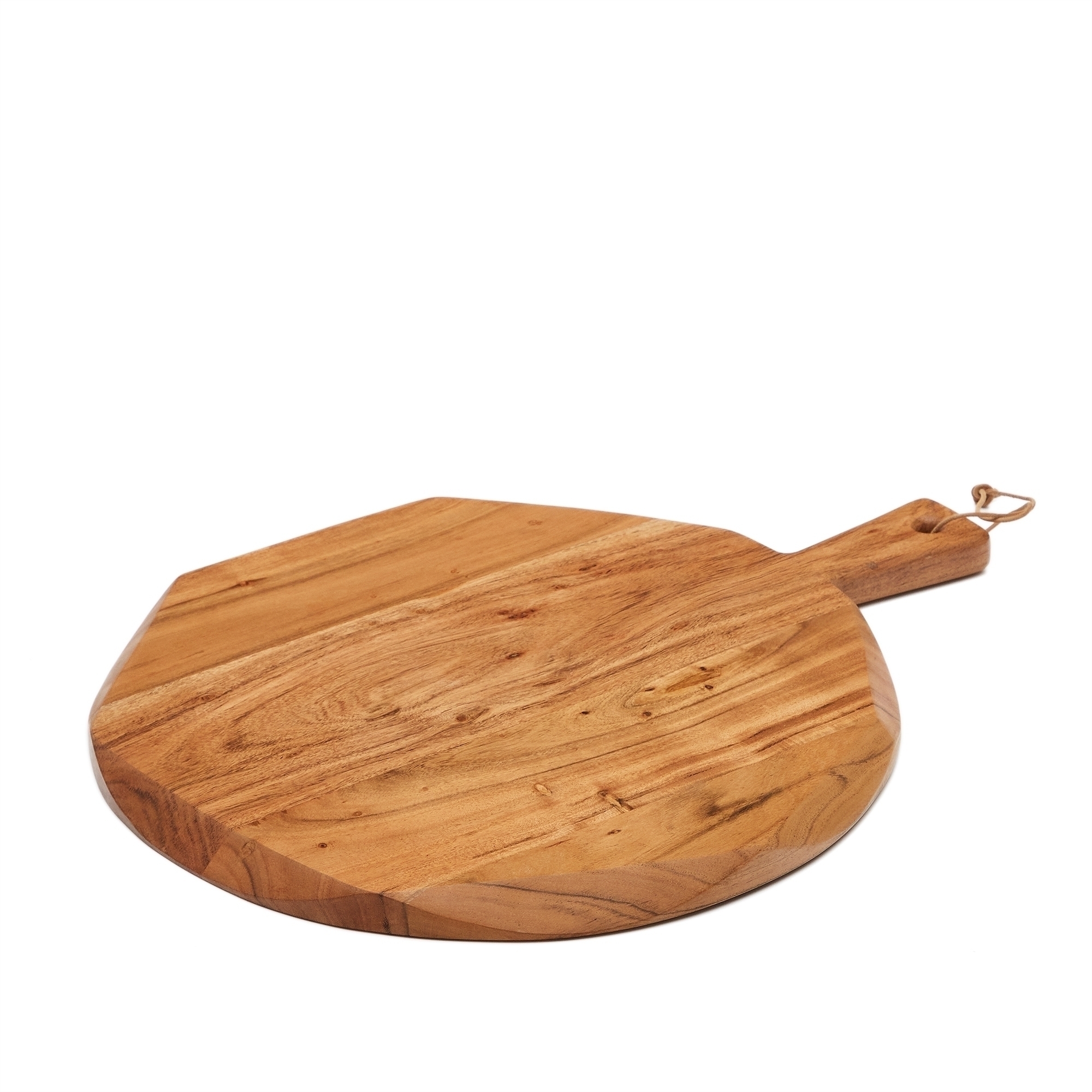 Доска круглой формы с неровными, хаотично стесанными краями. Она полностью сделана из массива акации и покрыта полиуретаном.