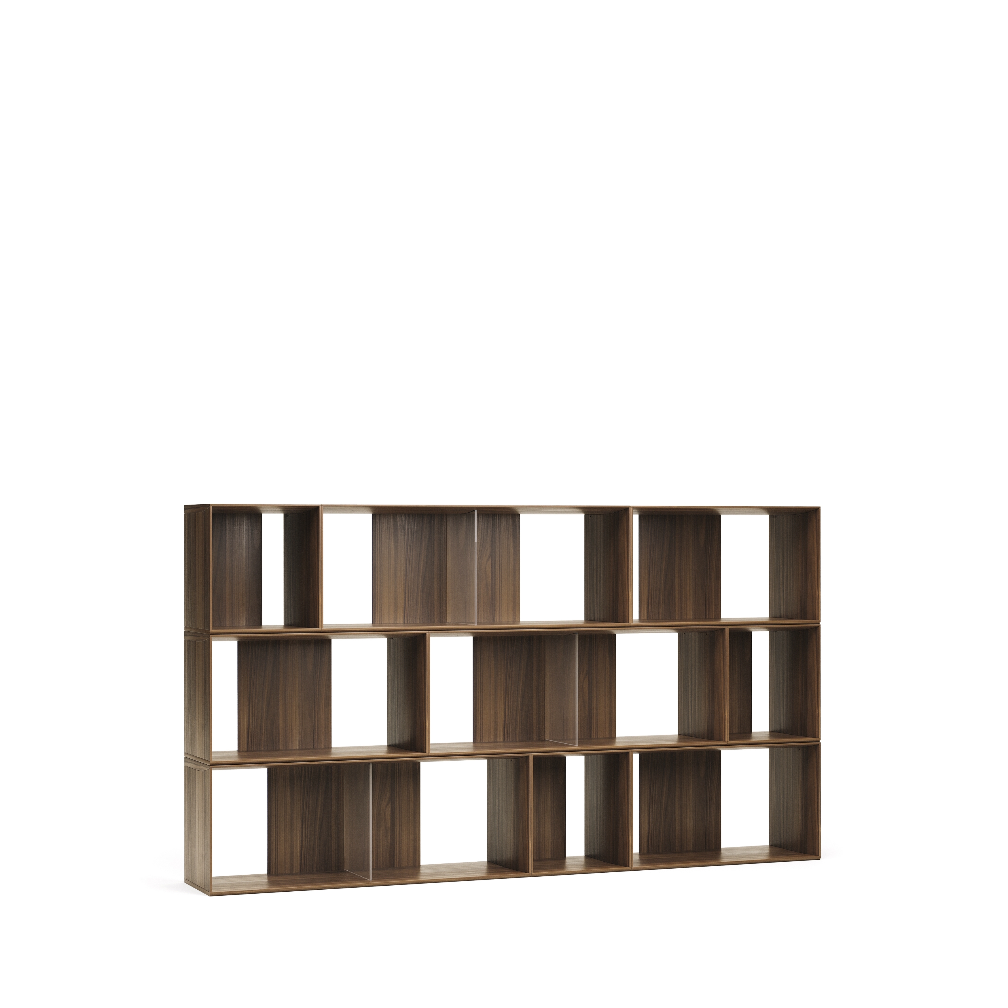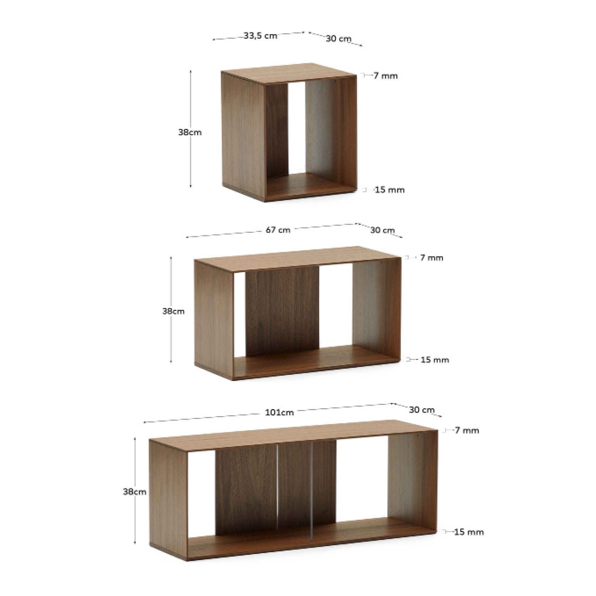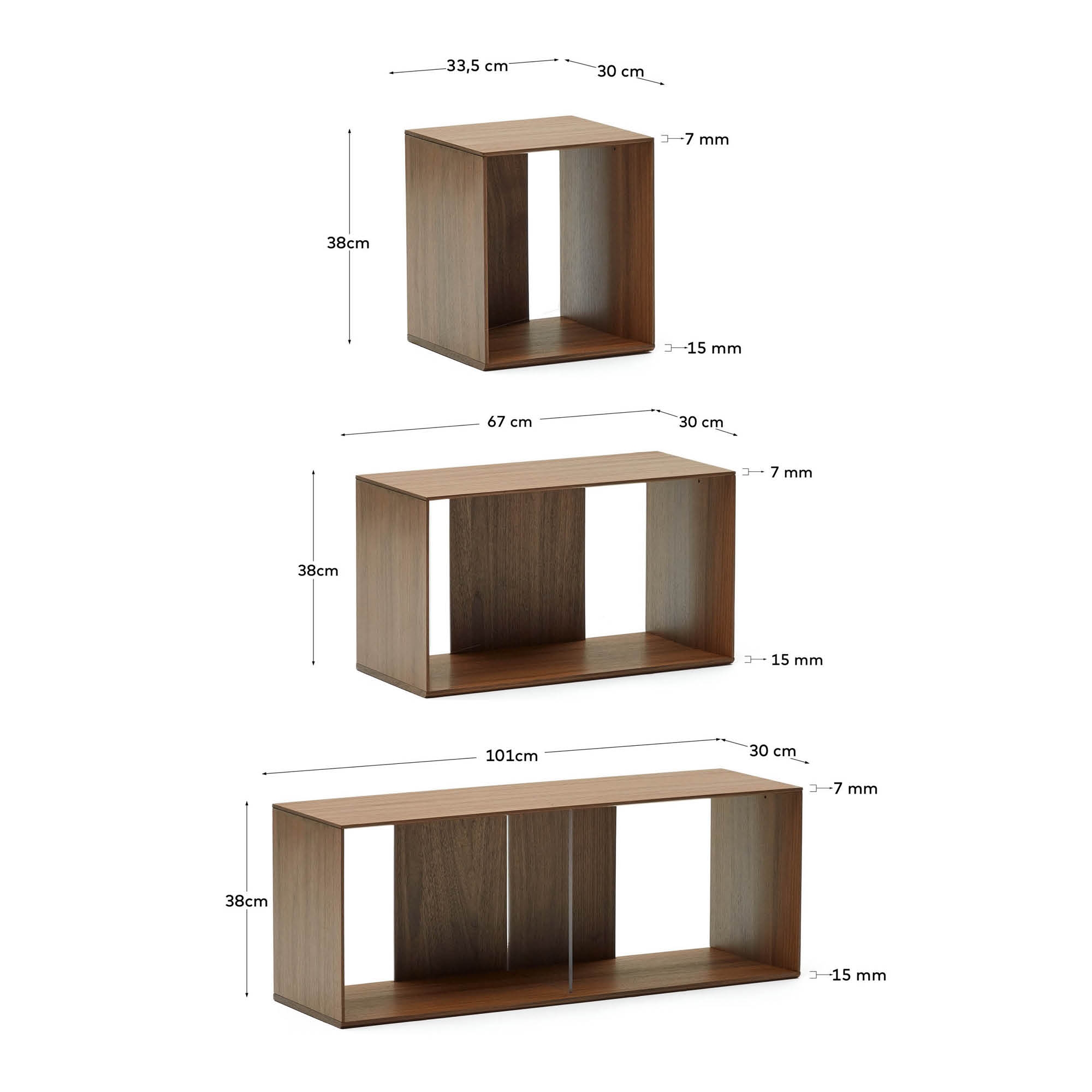Набор из 3 малых модульных полок, 3 средних модульных полок и 3 больших модульных полок из орехового шпона. Можно комбинировать с остальными модулями из коллекции. Включает в себя металлические кронштейны для крепления модулей друг к другу и к стене. Ноги не включены. Для каждого модуля, стоящего на полу, требуется набор из 5 ножек.