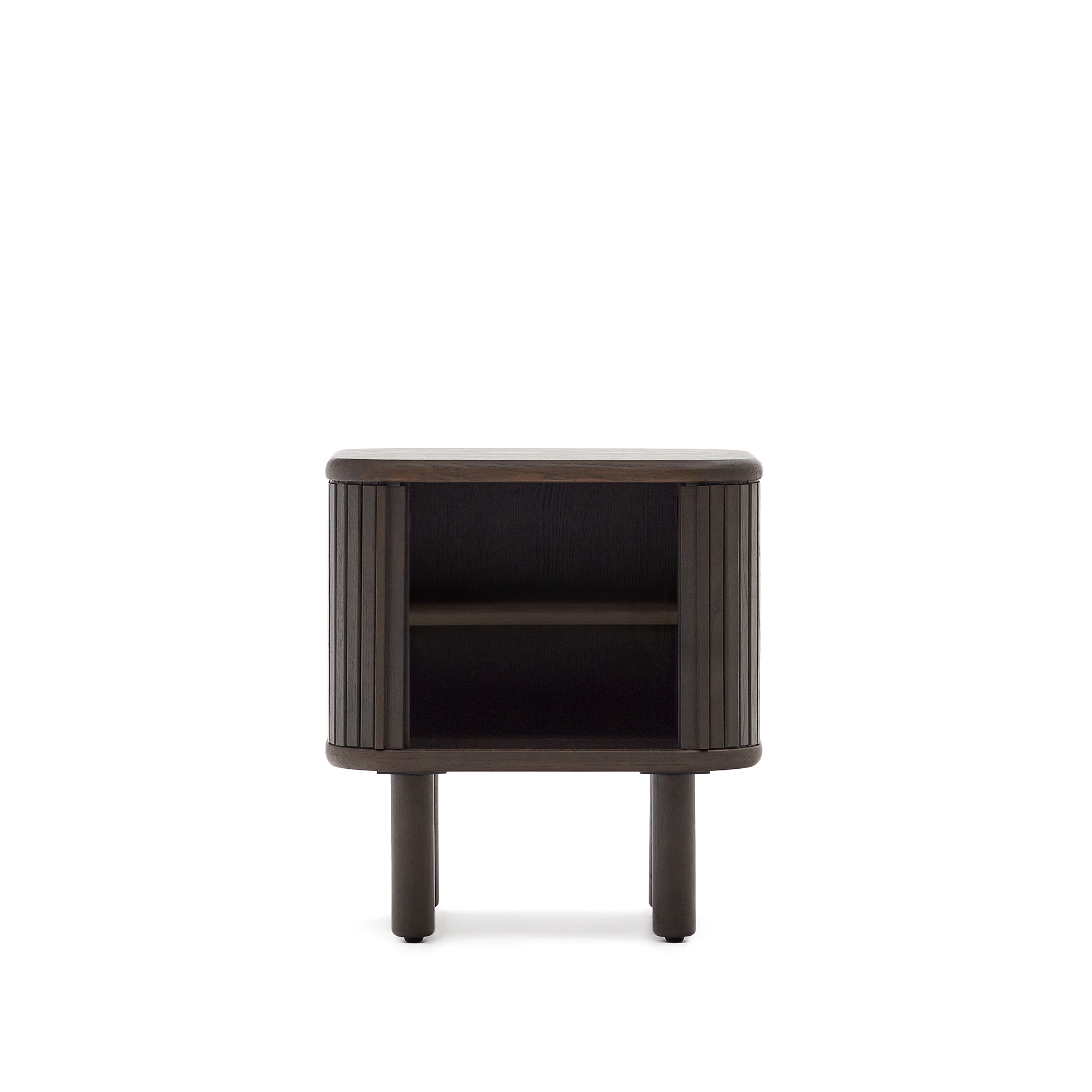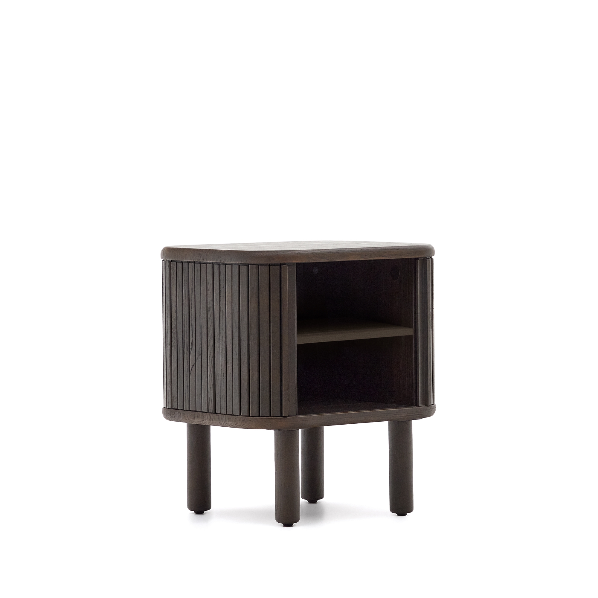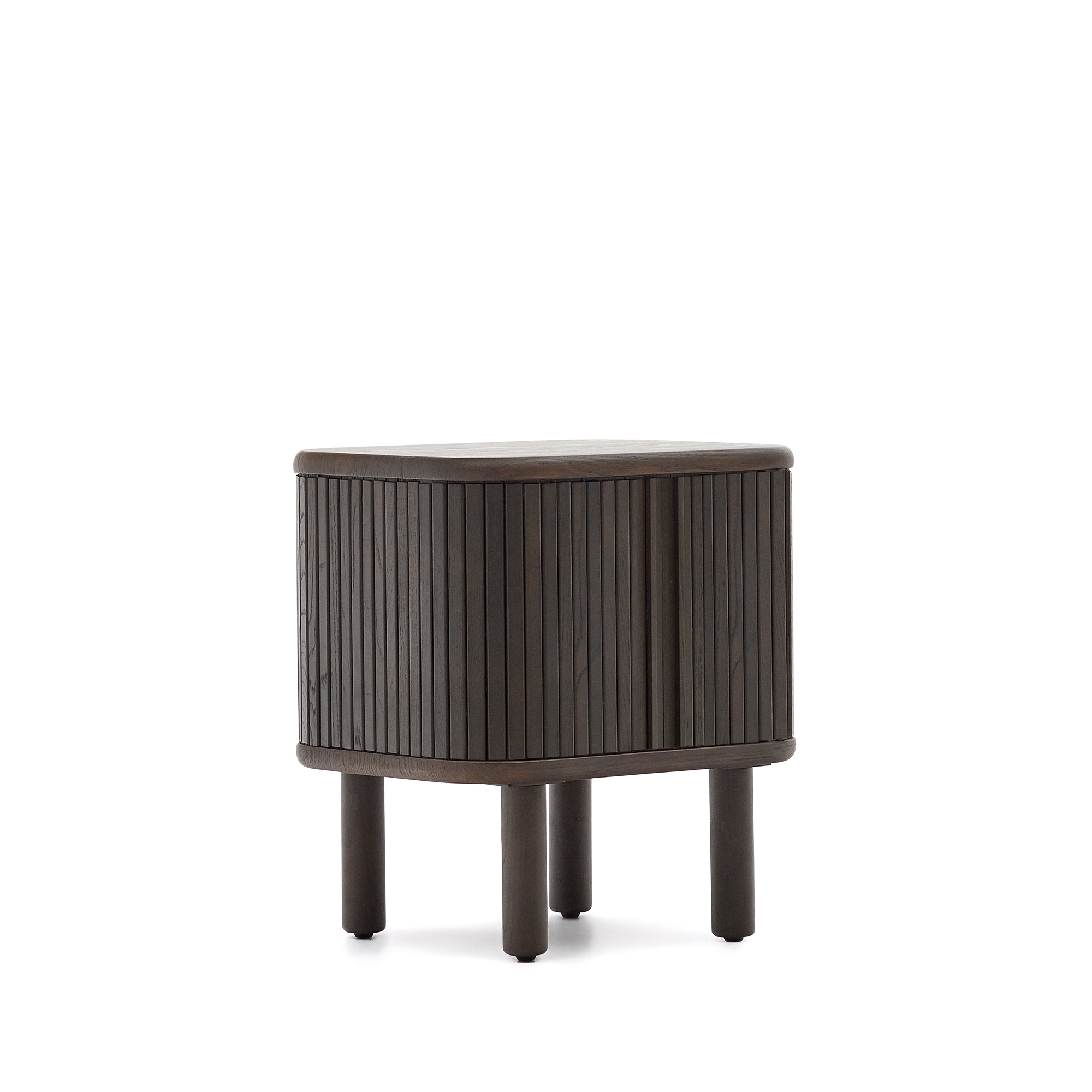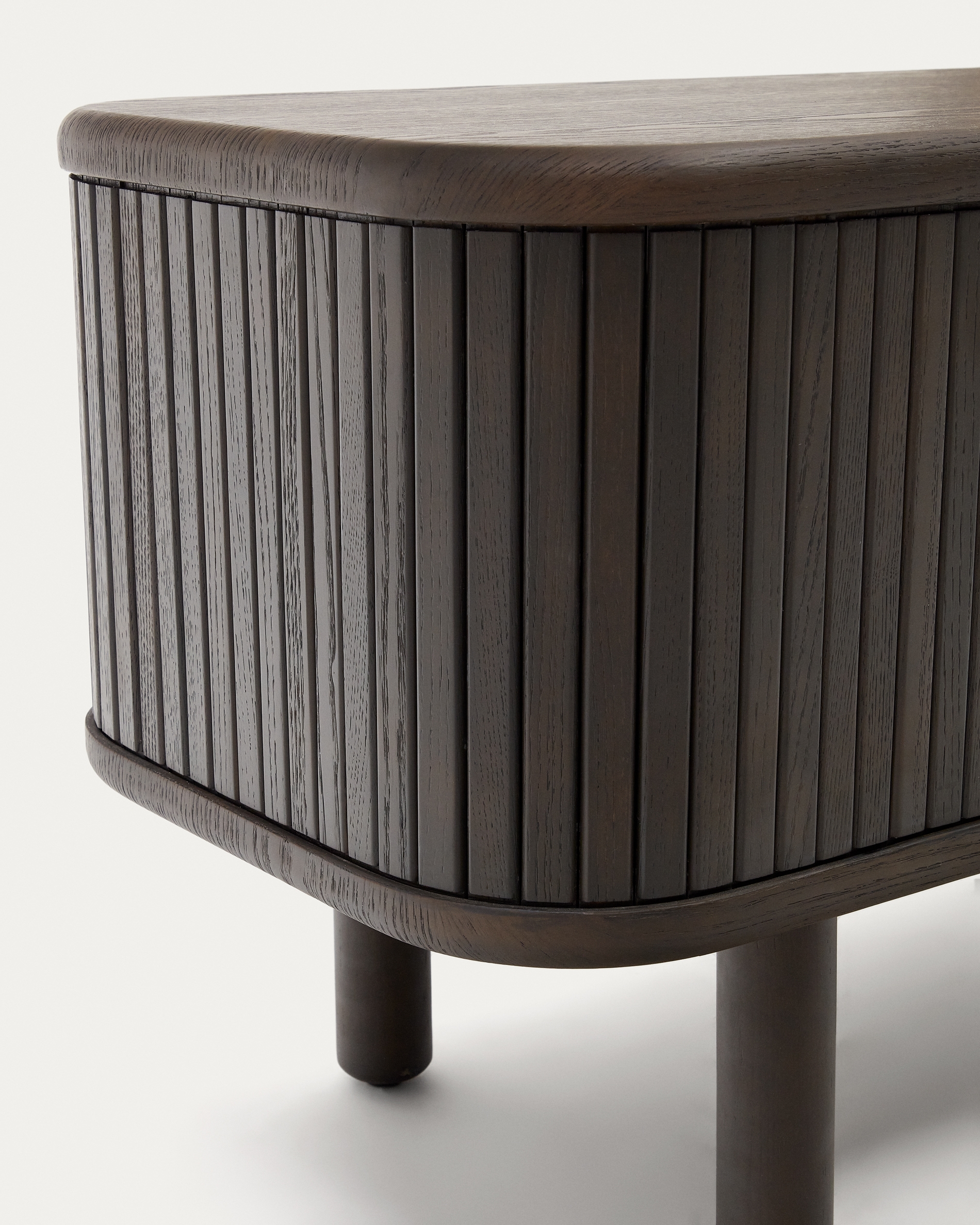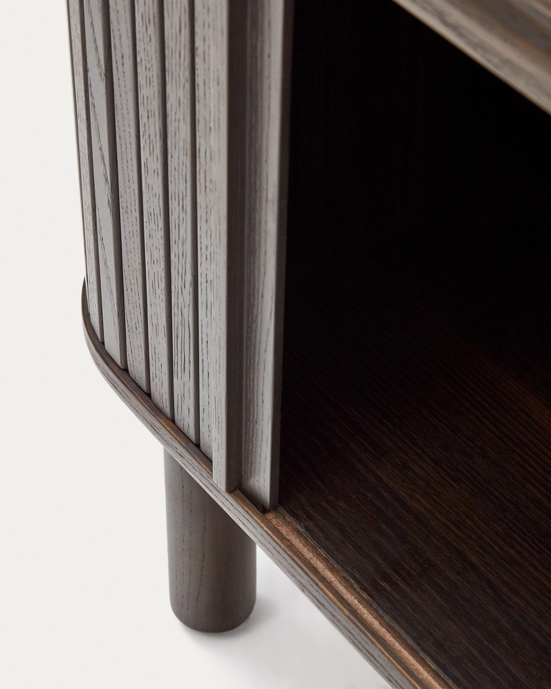 Команда Kave Home создала коллекцию Mailen современного дизайна с закругленными формами, выполненную из ясеневого шпона и раздвижными дверями с деревянными рейками, которые делают ее настоящим героем.