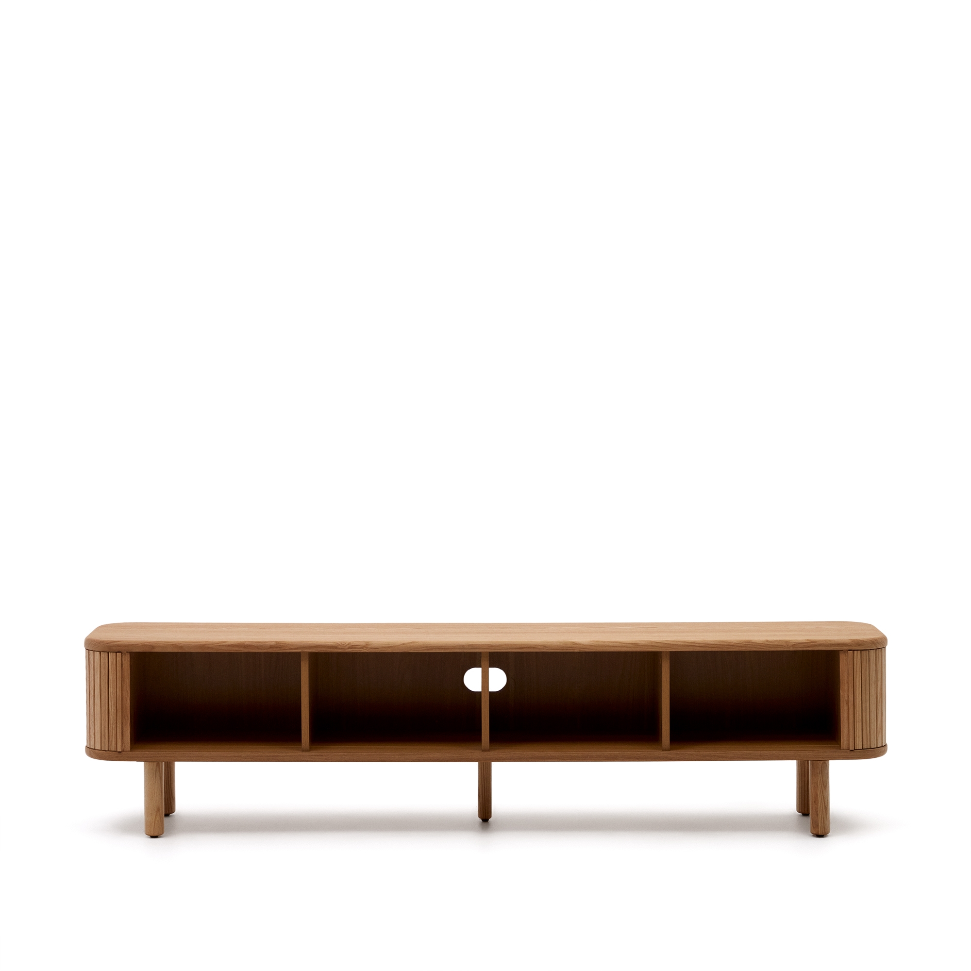 Команда Kave Home создала коллекцию Mailen современного дизайна с закругленными формами, выполненную из ясеневого шпона и раздвижными дверями с деревянными рейками, которые делают ее настоящим героем.