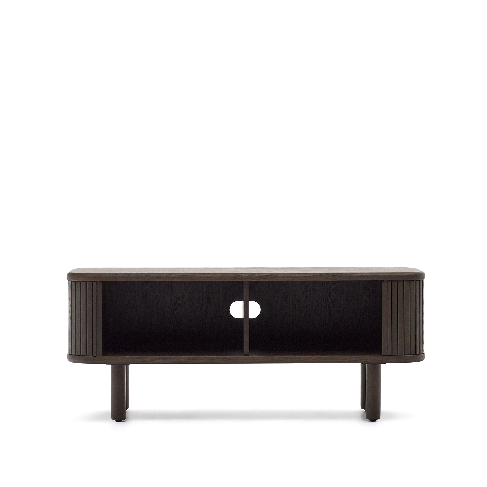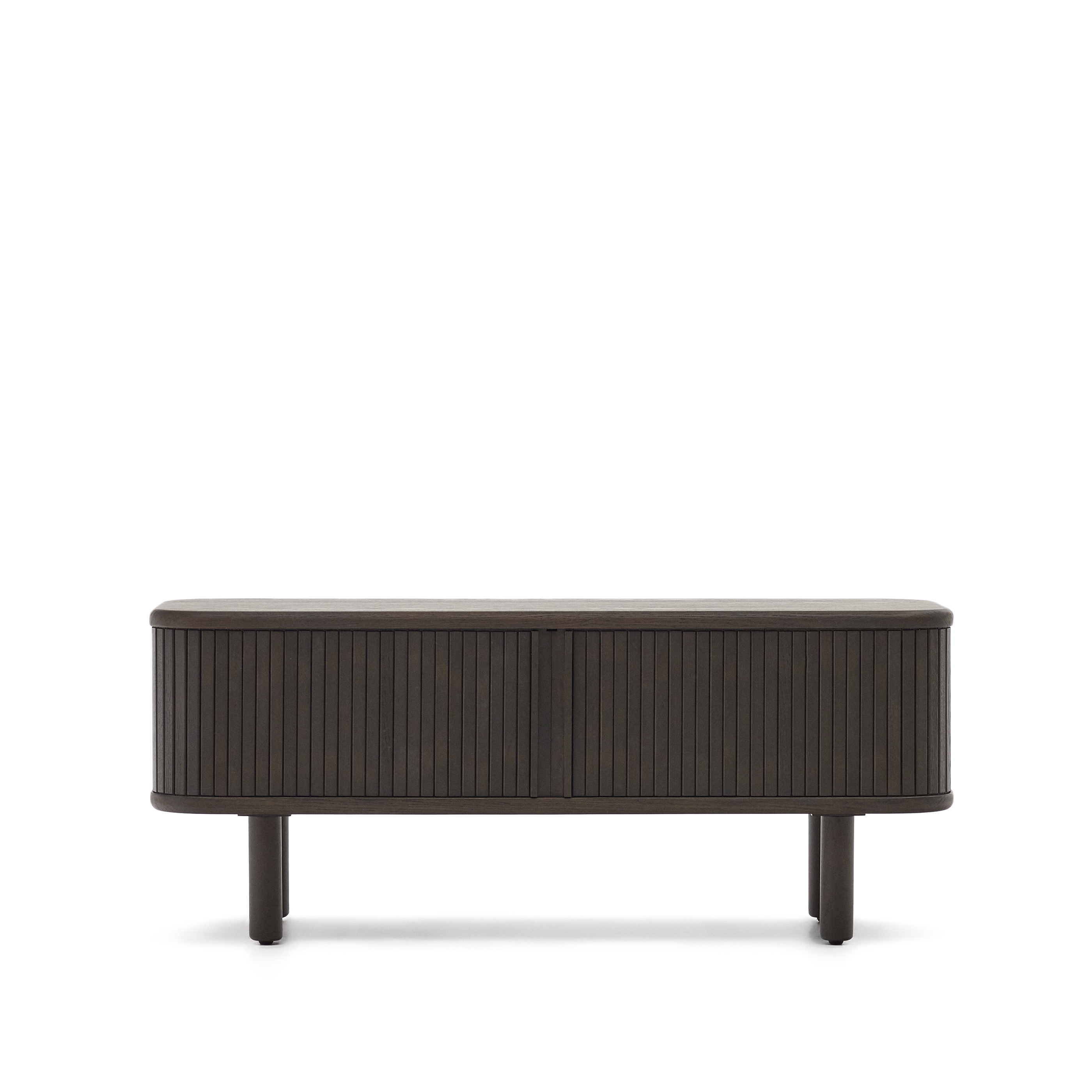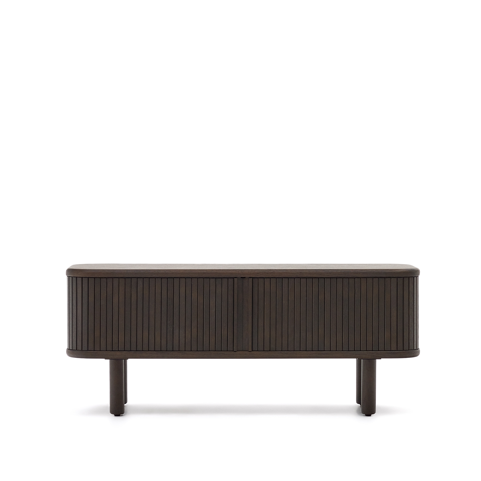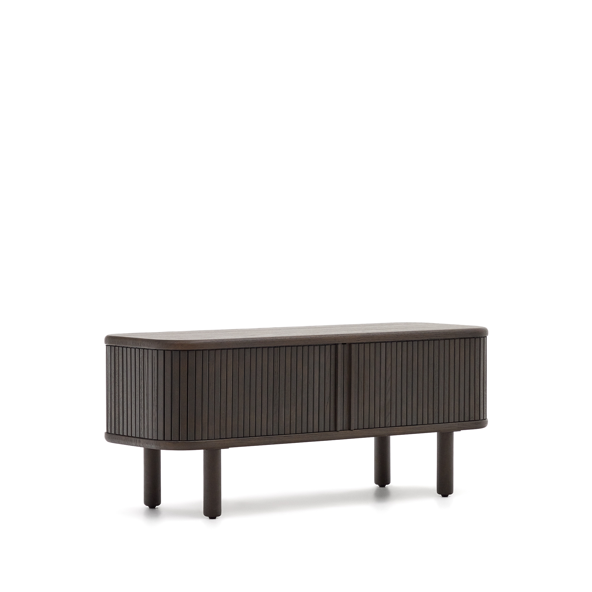 Команда Kave Home создала коллекцию Mailen современного дизайна с закругленными формами, выполненную из ясеневого шпона и раздвижными дверями с деревянными рейками, которые делают ее настоящим героем.