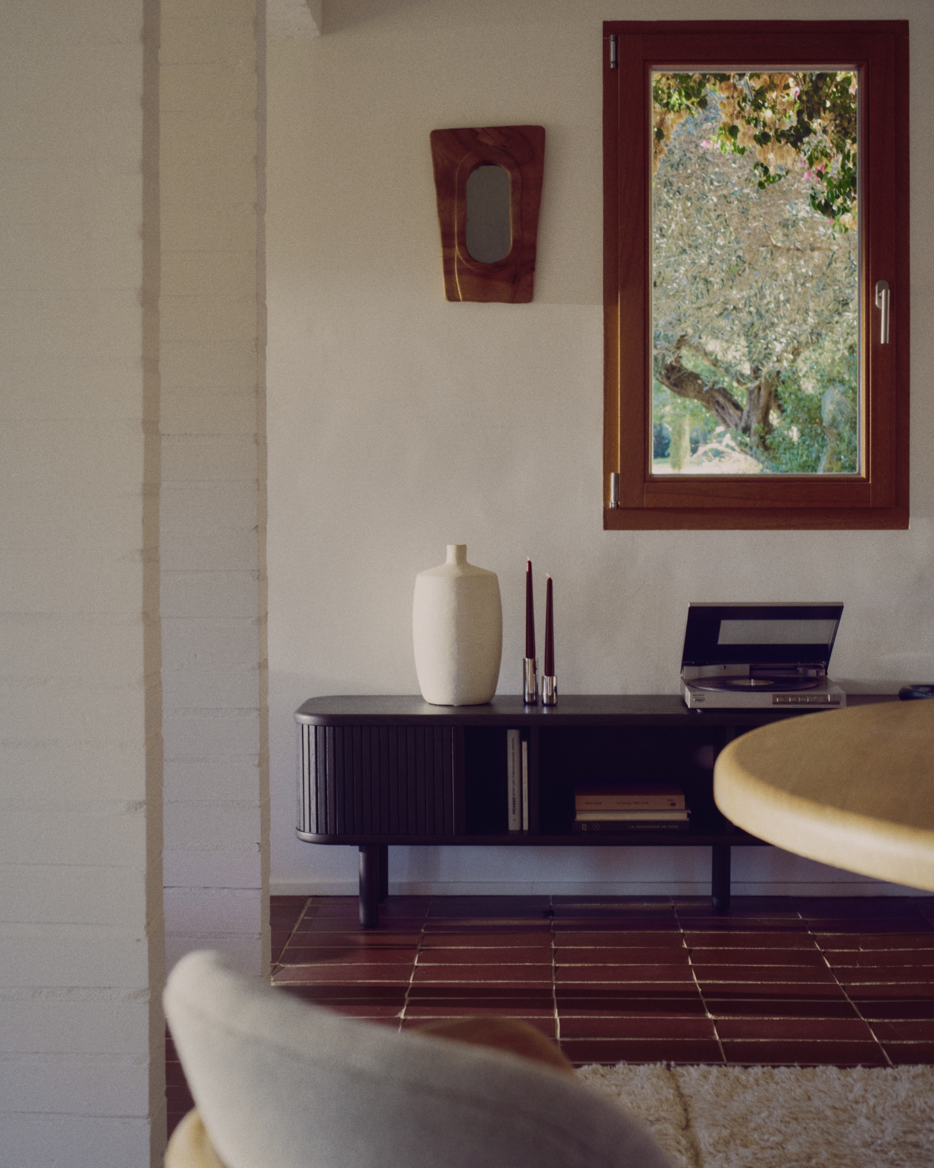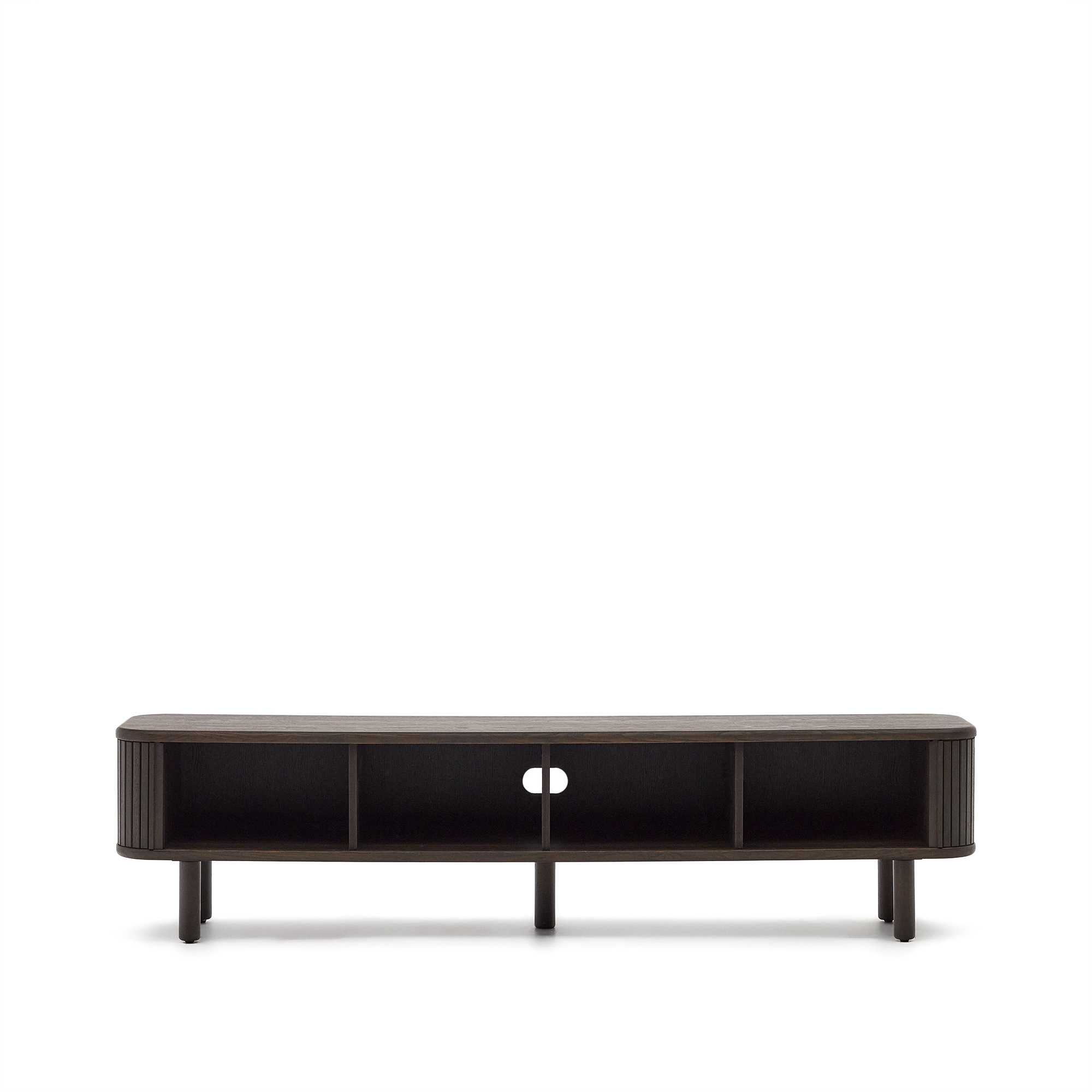 Команда Kave Home создала коллекцию Mailen современного дизайна с закругленными формами, выполненную из ясеневого шпона и раздвижными дверями с деревянными рейками, которые делают ее настоящим героем.