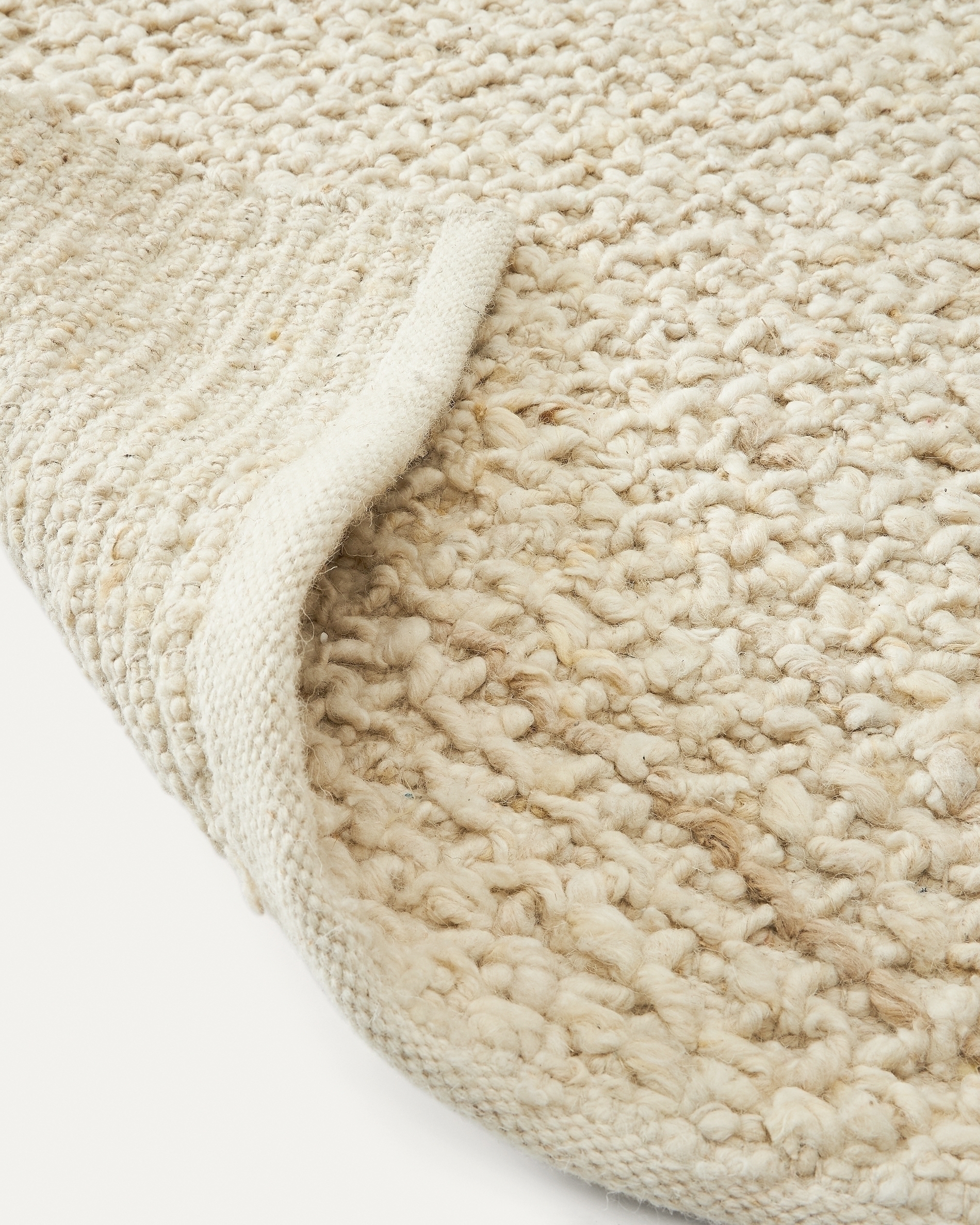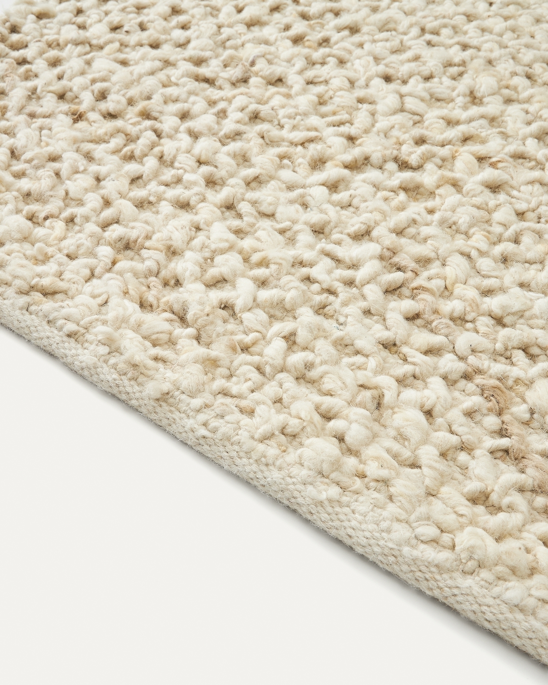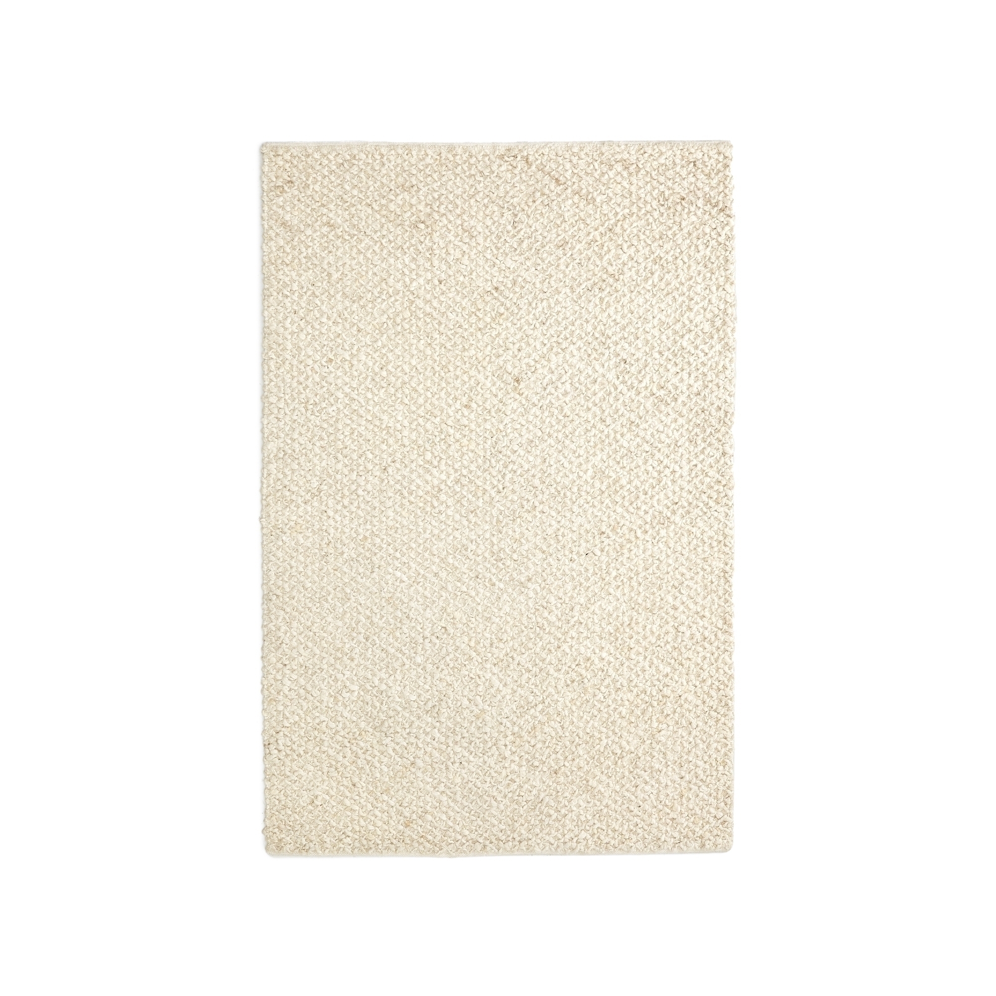 Ковер прямоугольной формы. Он соткан из натуральной овечьей шерсти, Цвет естественный, светло-бежевый. Край окантован шерстяной тесьмой.