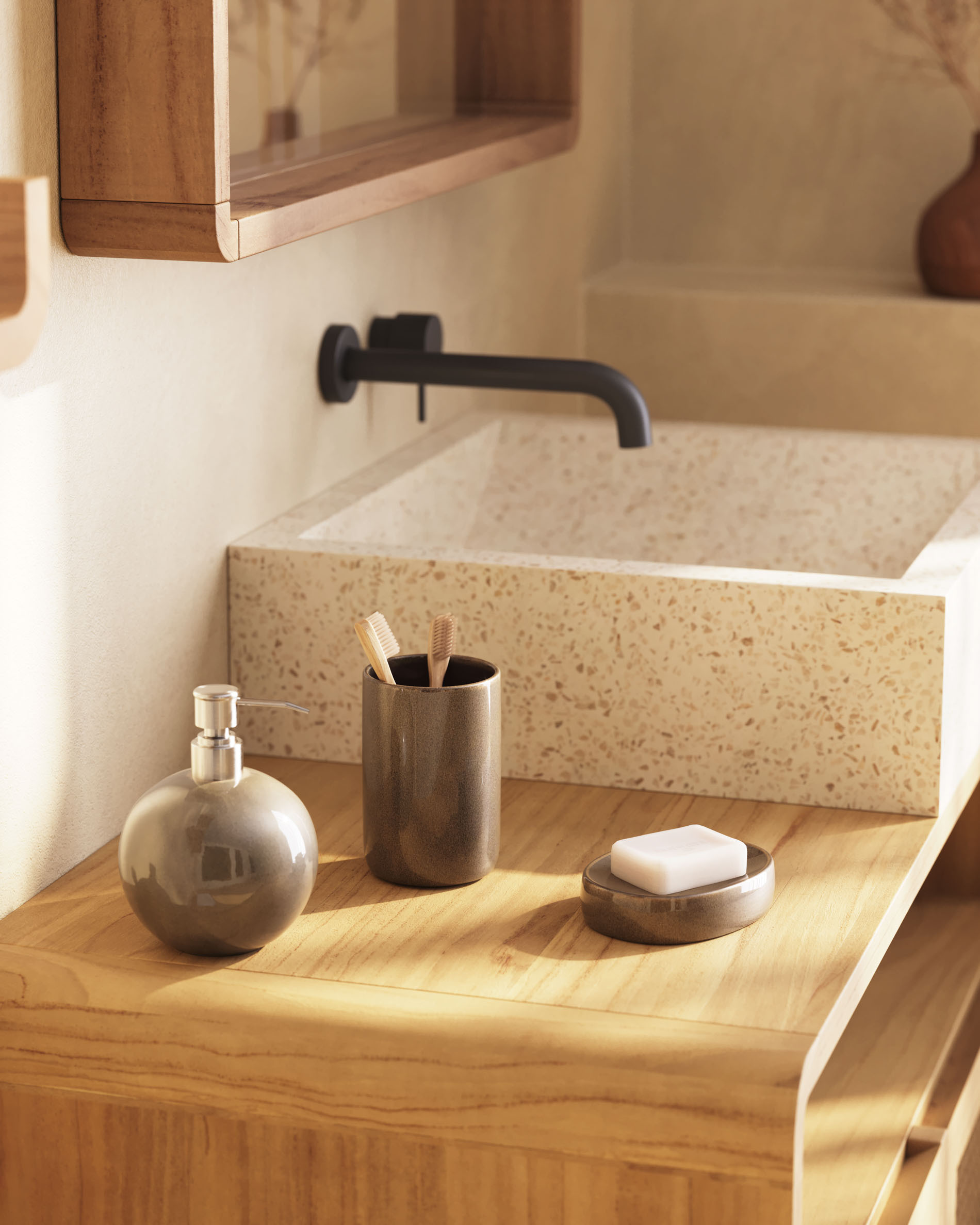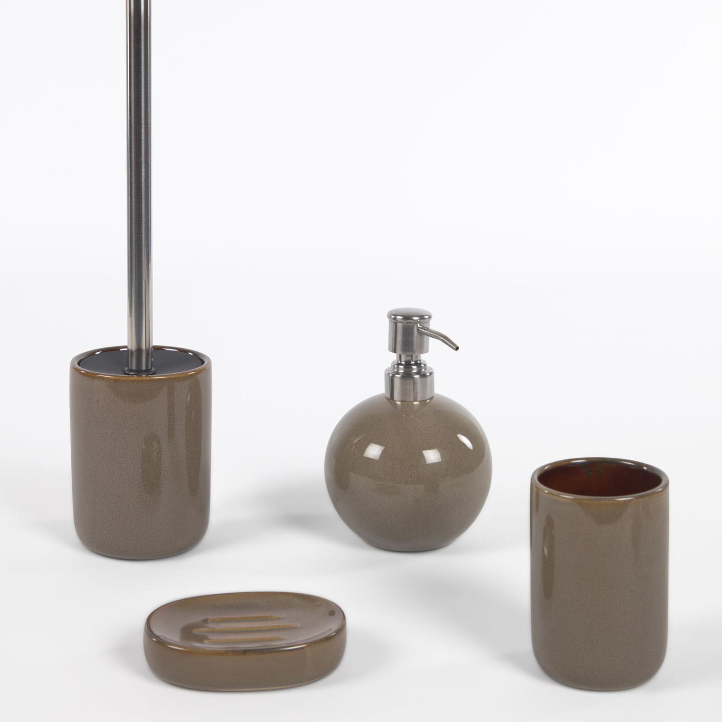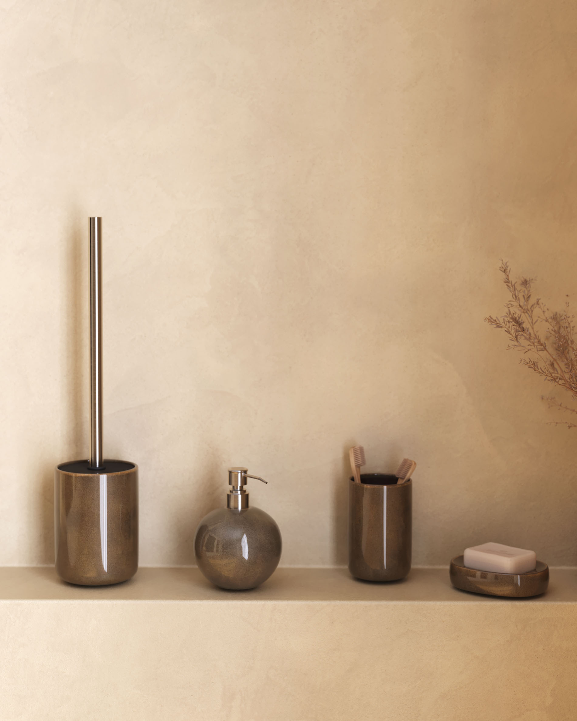 Коллекция состоит из четырех предметов: щетки, дозатора, мыльницы и стакана для зубных щеток.