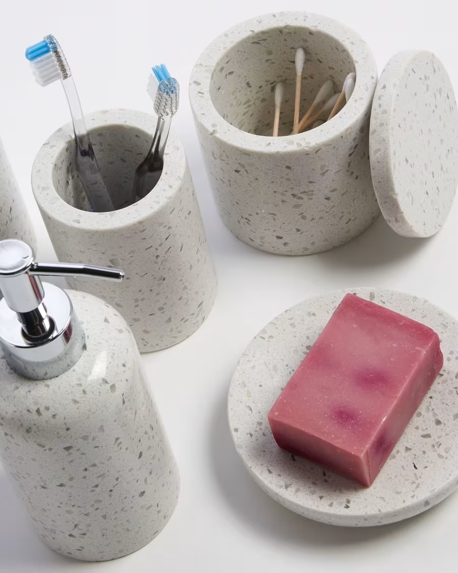 В коллекцию Marimba вошло пять предметов: держатель для туалетной щетки, мыльница, два стакана (для зубных щеток и ватных дисков), дозатор для жидкого мыла. Цвет белого терраццо выбран не случайно. Этот естественный природный орнамент прекрасно гармонирует с разным цветом фаянса, а также с практически любыми оттенками кафеля на стенах. Круглая форма и компактные размеры позволяют разместить все аксессуары рядом в удобном порядке.