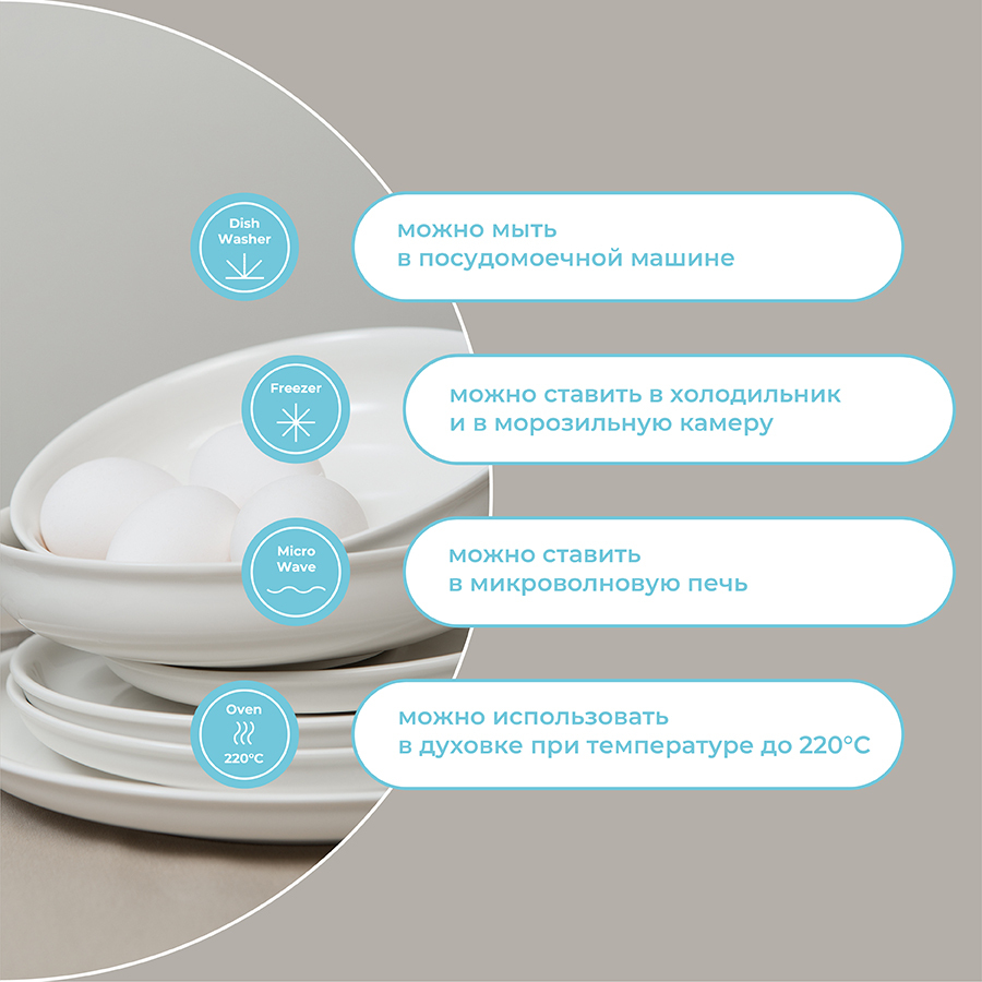 Чистое сырье высочайшего качества и собственная формула глазуровки с обжигом при температуре 1250 °C делают изделия из фарфора особо прочными, устойчивыми к растрескиванию и появлению сколов. Глазурь и декор не тускнеют со временем, сохраняя первоначальный цвет и блеск. Наши продукты прошли испытания на отсутствие в составе свинца и кадмия в соответствии со стандартными тестами FDA.