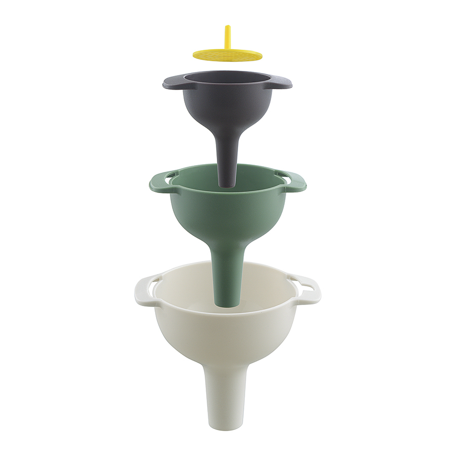 Набор Bakke включает три воронки и специальный фильтр. С помощью этого комплекта вы можете аккуратно переливать жидкости в емкости различных объемов, а также фильтровать соки, соусы или бульоны.