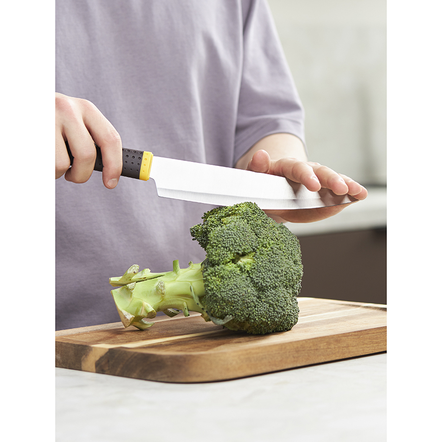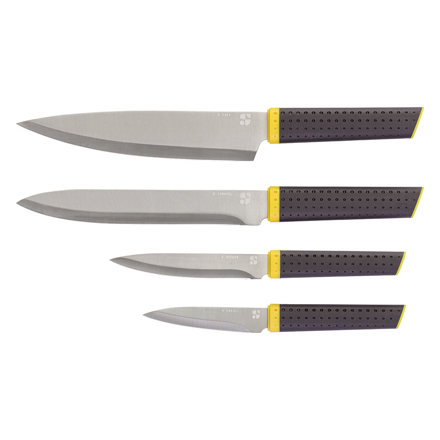 - В комплекте представлены ножи: поварской, разделочный, универсальный и для чистки овощей.