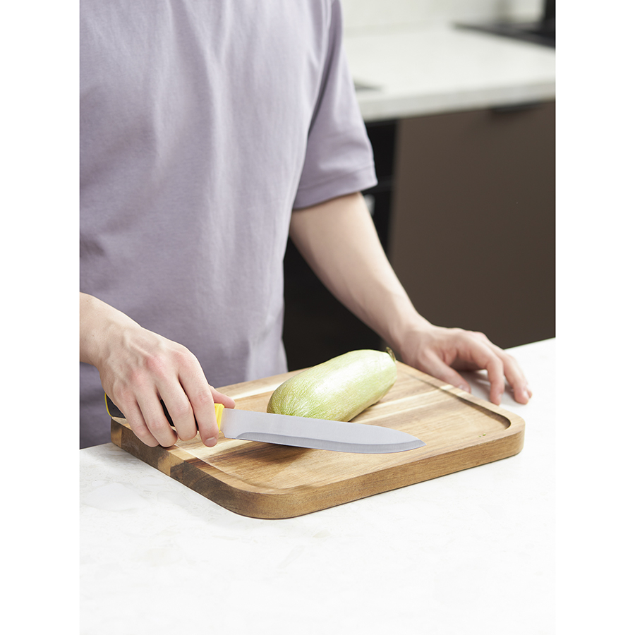 Ножи после использования очищать в теплой мыльной воде при помощи мягкой губки. Запрещается применение абразивных материалов и агрессивной бытовой химии.