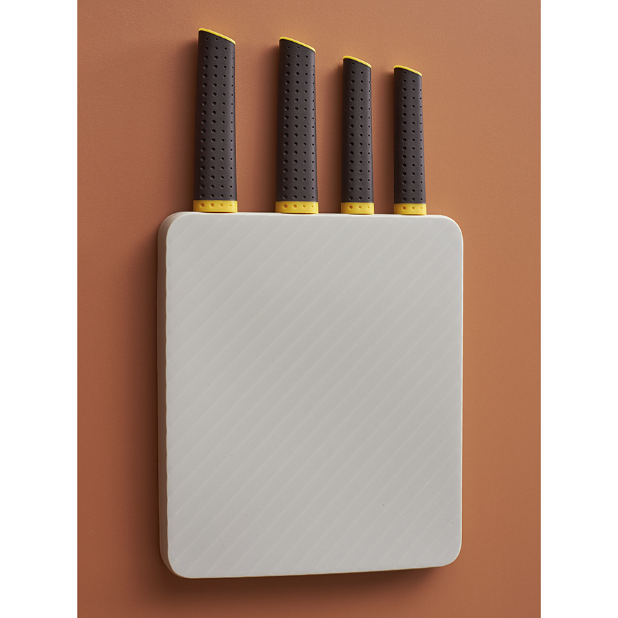 Материалы: подставка – полипропилен; рукоятки ножей – полипропилен, термопластичная резина; лезвия ножей – нержавеющая сталь 3CR14. Размеры блока: 23,3х20,5х1,8 см. Размеры ножей: поварской – 32х4,1х1,8 см; разделочный – 32,9х3,1х1,8 см; универсальный – 24х2,3х1,5 см; для очистки овощей – 20,8х2,2х1,5 см. Количество предметов в наборе: 5 шт.