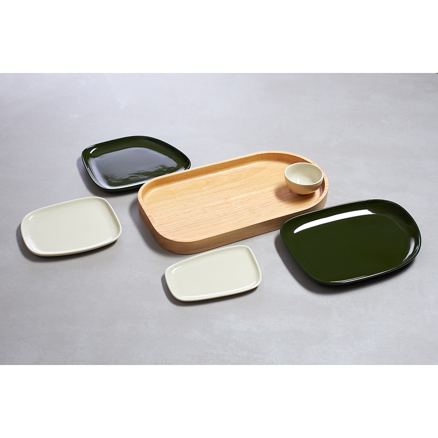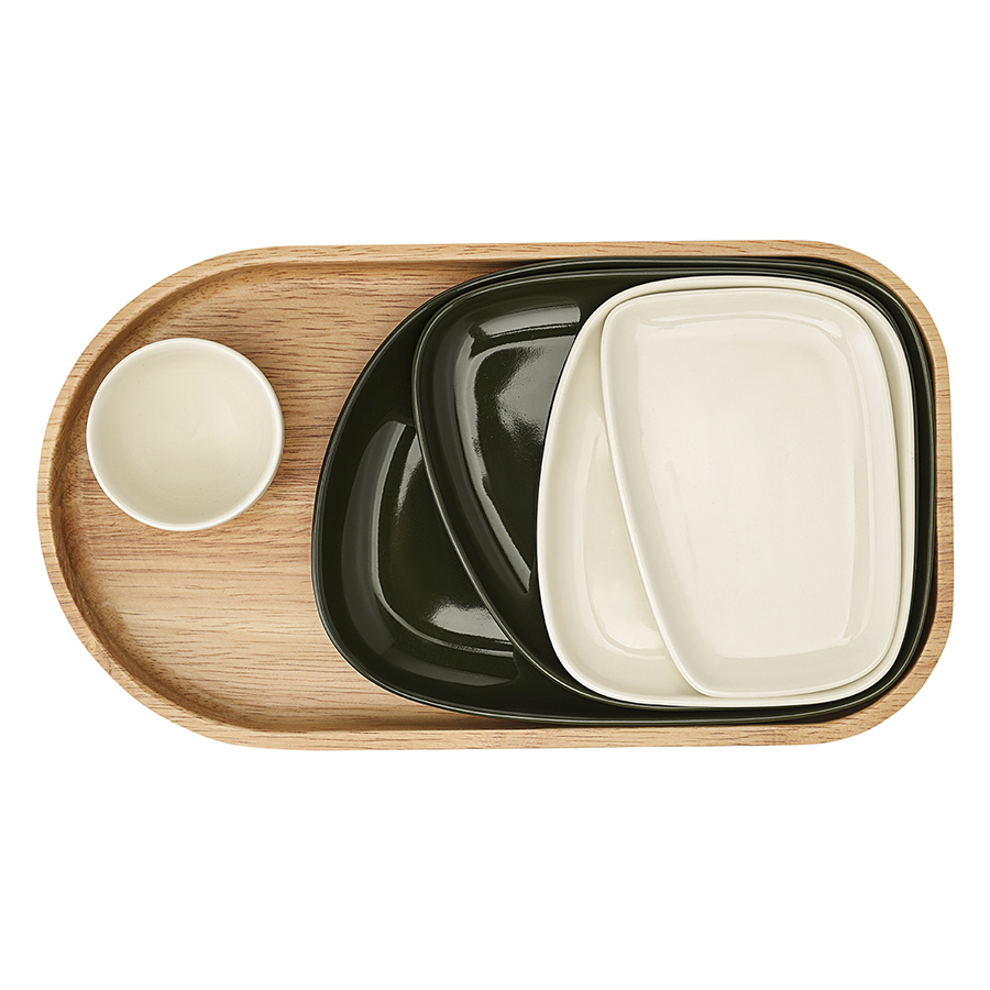 Материалы: тарелки – фарфор; поднос – каучуковое дерево. Размеры тарелок: 20х15х1,5 см; 17х15х1,4 см; 14х12,3х1,1 см; 13,7х9х1 см. Размеры чаши: 6,4х5,8х3,8 см. Объем чаши: 44 мл. Размеры подноса: 30,8х17,2х2,5 см. Количество предметов в наборе: 6 шт.