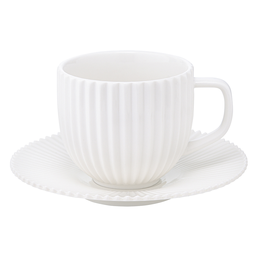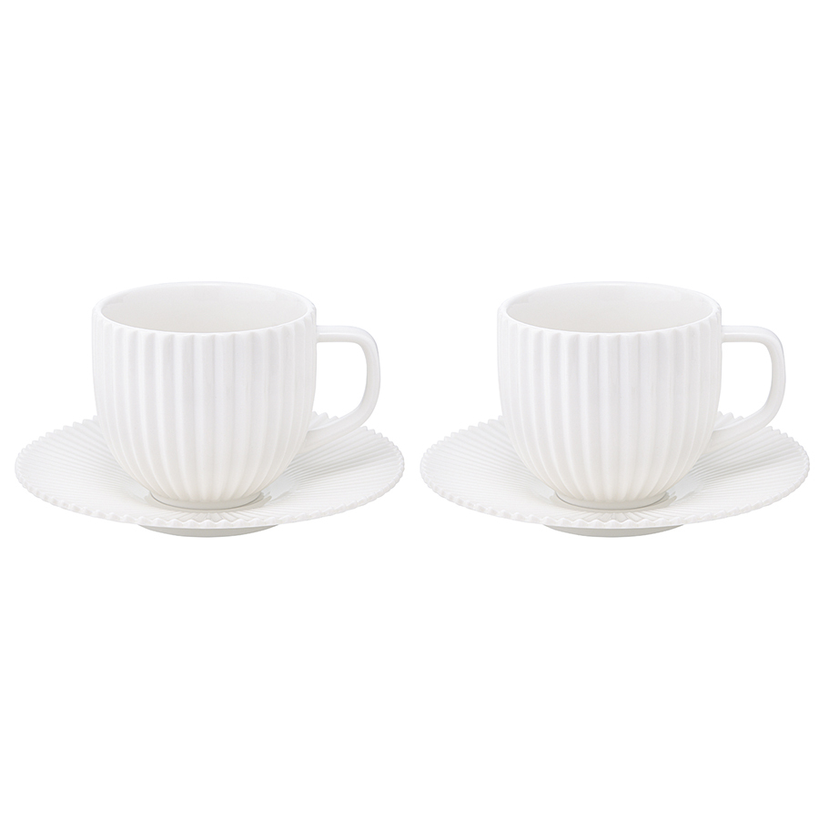 Набор из двух чайных пар белого цвета подойдет как для праздничной сервировки, так и для ежедневного чаепития. Рифленая поверхность блюдец красиво отражает свет, а чашки удобно ложатся в руку. Посуда сделана из фарфора — надежного и прочного материала, который не пожелтеет, не поцарапается и будет каждый день радовать своим превосходным внешним видом. Чайные пары можно дополнить другими предметами из серии Edge — например, тарелками, салатниками или подставками для яиц.