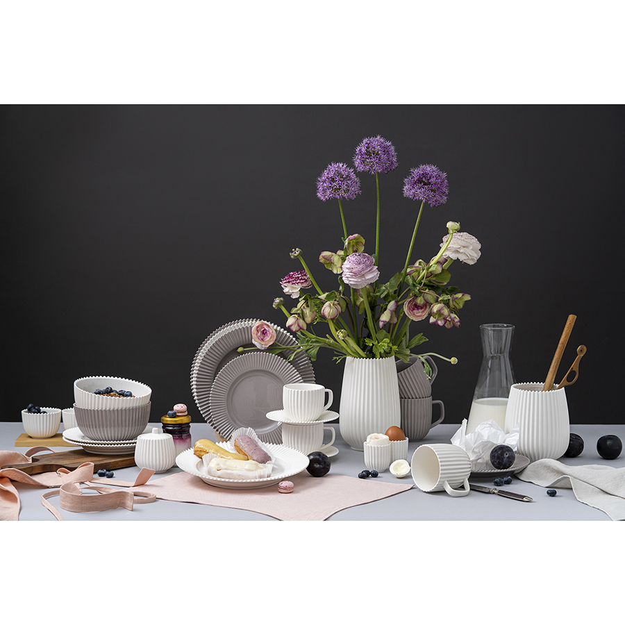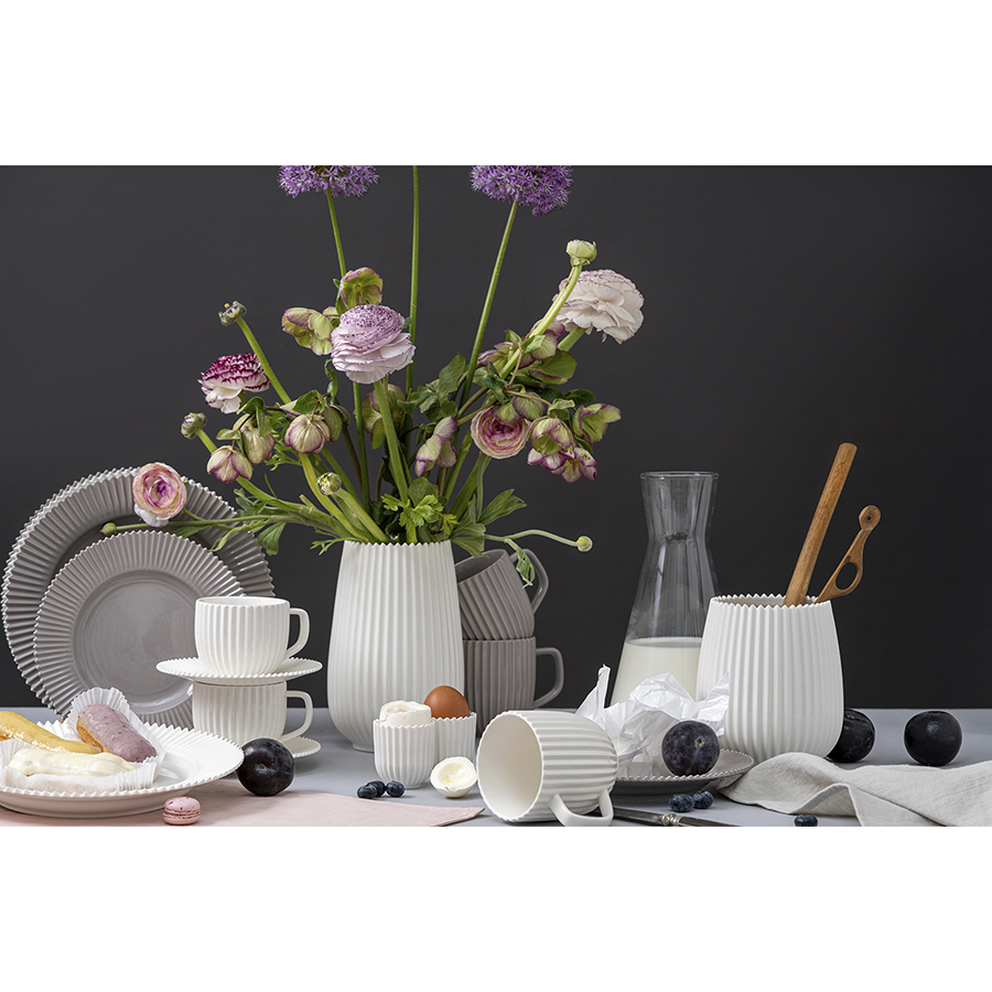 Набор из двух фарфоровых кружек белого цвета — для тех, кто любит большие порции и долгие чаепития. Несмотря на свой размер, кружки очень легкие и удобно ложатся в руку, а рифленая поверхность добавляет дизайну утонченность и изящество. А еще они идеально сочетаются с другой посудой из серии Edge — тарелками, салатниками, сахарницами, вазами и другими предметами.