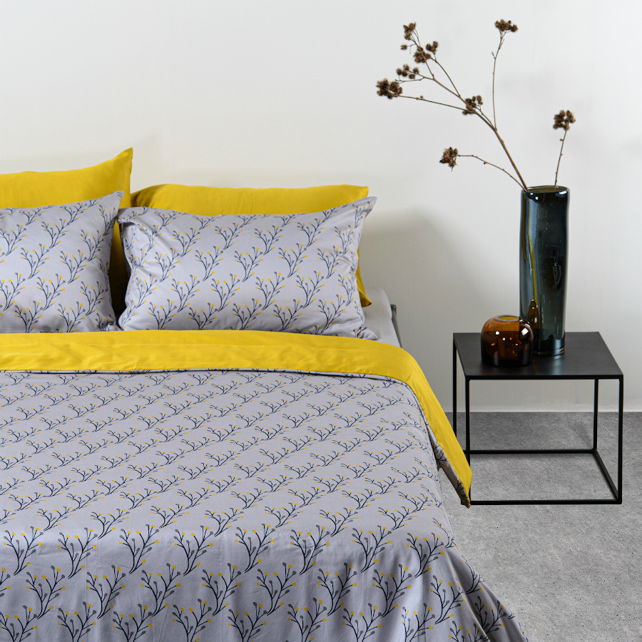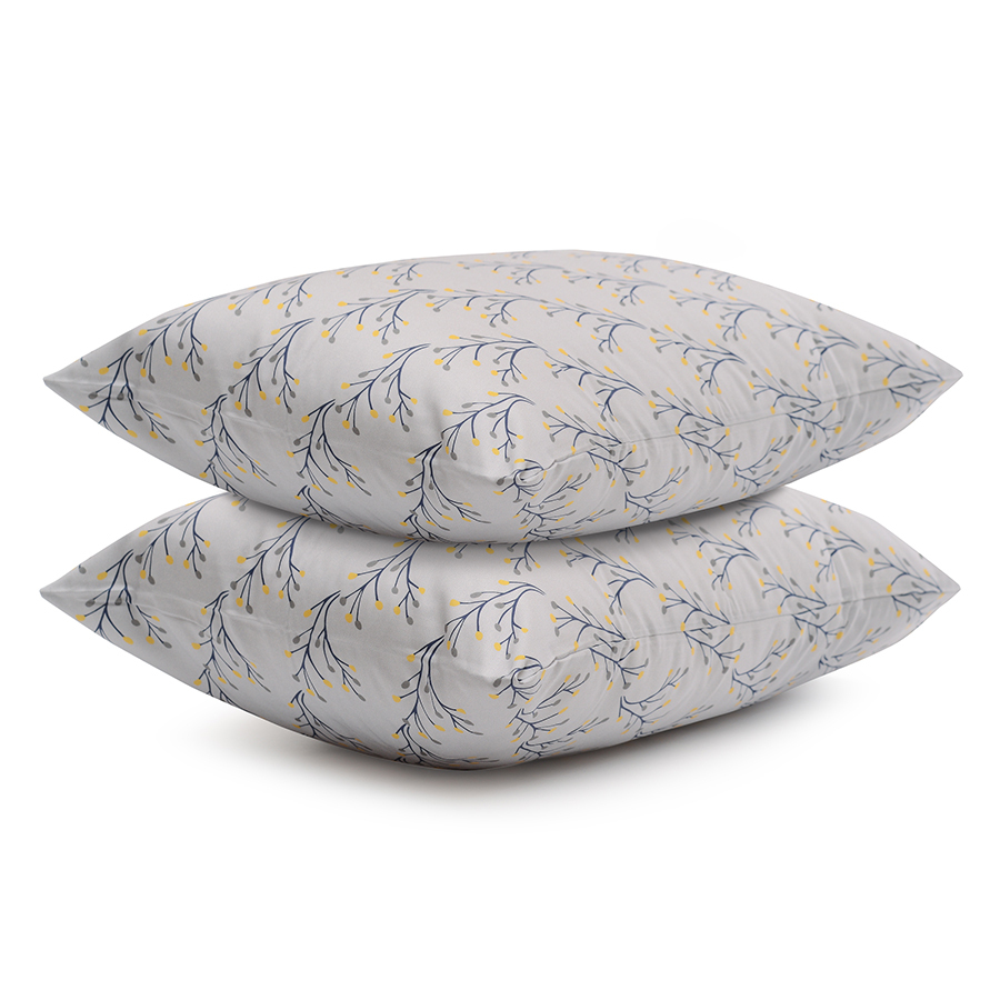 Комплект из двух наволочек базового цвета украсили флористическим рисунком «Соцветие». Изделия выполнены из гладкого хлопкового сатина плотностью 210 TC. Данный материал отличается особым способом пряжи – нити переплетаются в скрученном виде, что придает ткани дополнительную прочность.