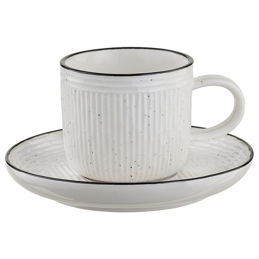 Кофейная пара из белоснежного фарфора серии Contour станет неотъемлемой частью уютного чаепития. Рельефная поверхность и декоративная окантовка придают посуде оригинальный вид. Материал изготовления неприхотлив в уходе, не впитывает загрязнения, является экологичным и безопасным для здоровья. Набор идеально подходит как для повседневной, так и для праздничной сервировки стола.