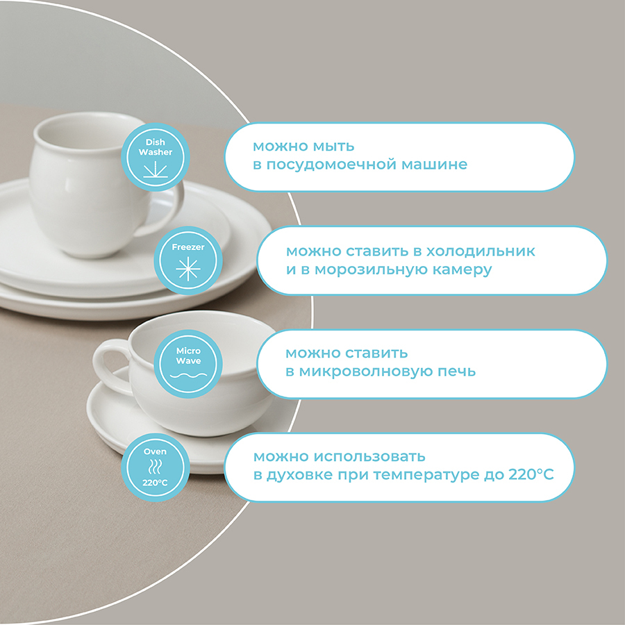 Чистое сырье высочайшего качества и собственная формула глазуровки с обжигом при температуре 1250 °C делают изделия из фарфора особо прочными, устойчивыми к растрескиванию и появлению сколов. Глазурь и декор не тускнеют со временем, сохраняя первоначальный цвет и блеск. Наши продукты прошли испытания на отсутствие в составе свинца и кадмия в соответствии со стандартными тестами FDA.
