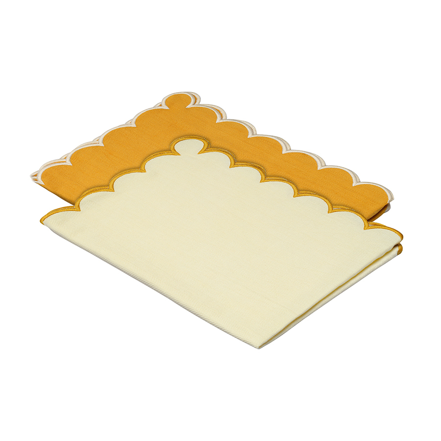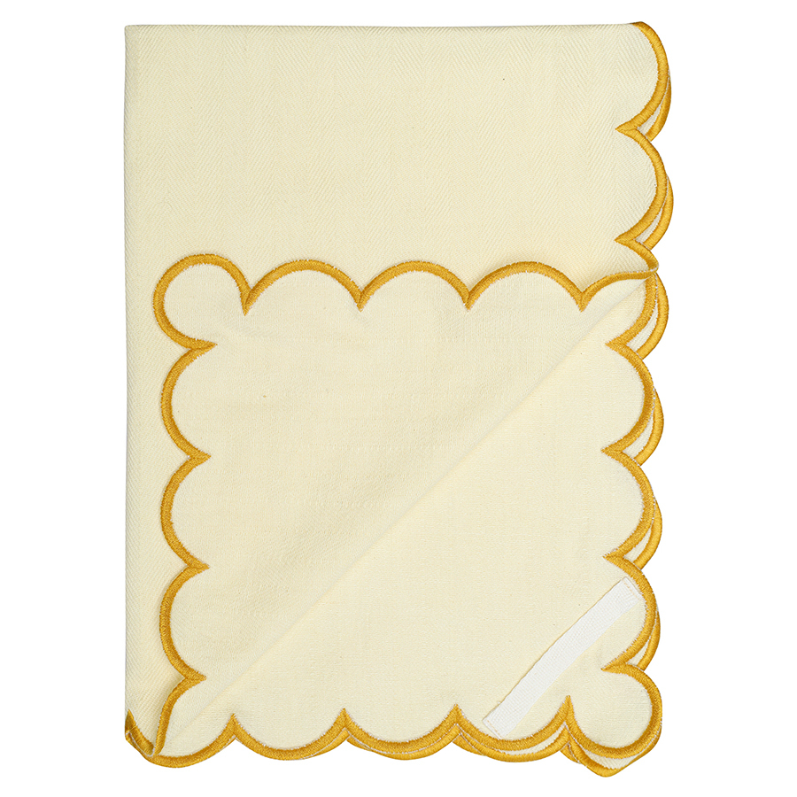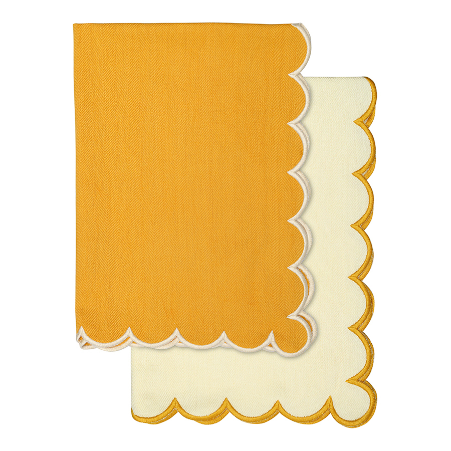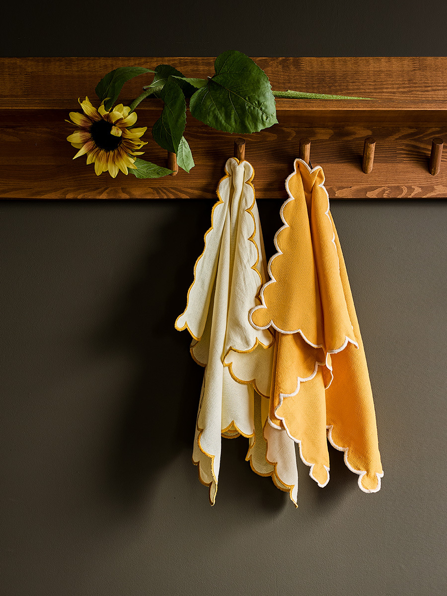 Набор кухонных полотенец с контрастным кантом горчичного цвета из коллекции Trendy Ruffles идеально подойдет для повседневных задач и в качестве стильного акцента. Текстиль с волнистой отделкой, напоминающей изящные раковины морских гребешков, стал ярким элементом стиля Ар Деко – и сейчас возвращается в моду, появляясь в самых актуальных интерьерных решениях.