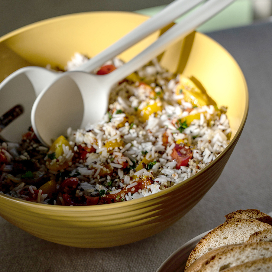 Приборы для салата Tierra отлично гармонируют с другими предметами коллекции. В сочетании с миской или блюдом они образуют идеальную композицию для сервировки, которая будет одинаково хорошо смотреться как в повседневной, так торжественной обстановке. Можно мыть в посудомоечной машине при температуре не более 55 градусов. Приборы не подходят для микроволновой печи.