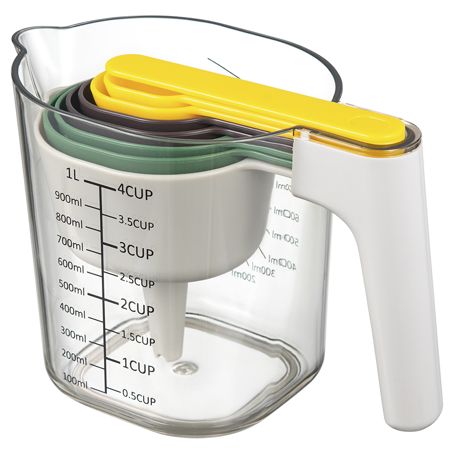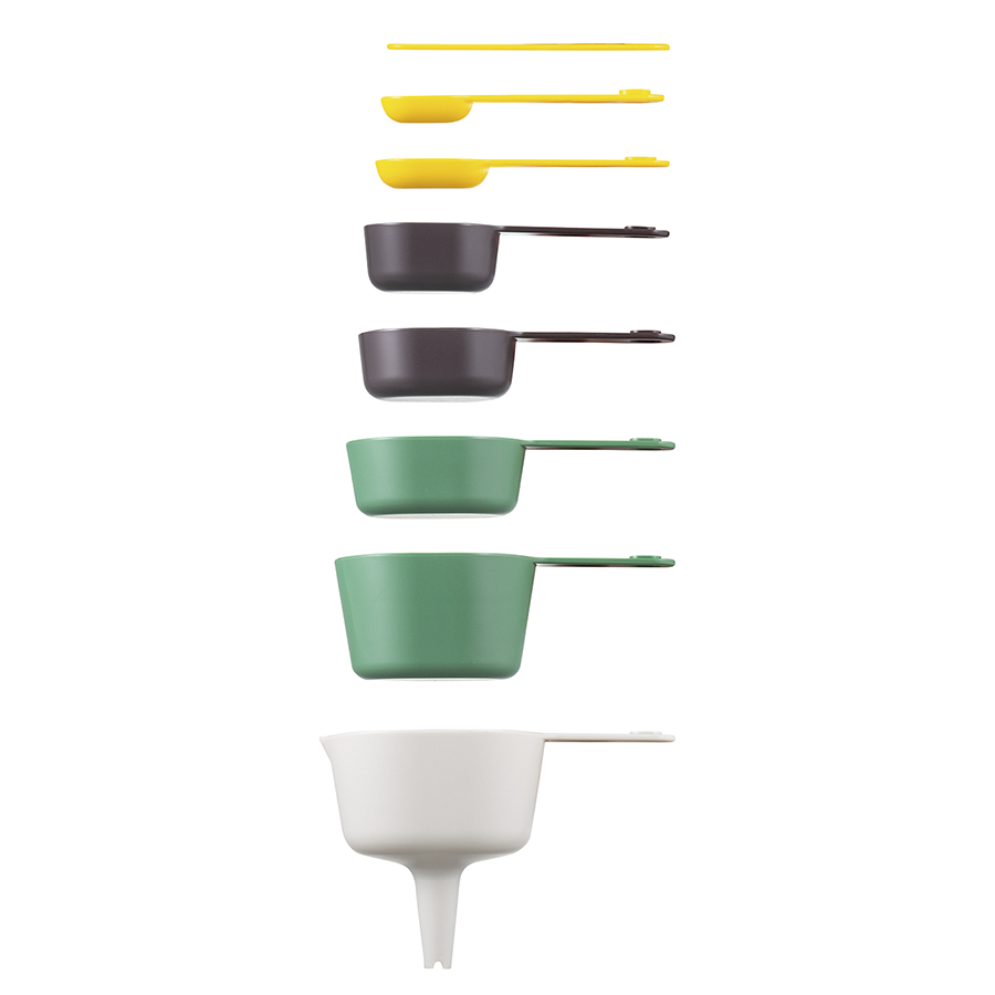 Набор из 9 предметов Gro включает в себя: мерный стакан, воронку и 7 ложек разных объемов. Такой комплект помогает четко соблюдать пропорции добавляемых ингредиентов, что существенно облегчает процесс приготовления различных блюд.