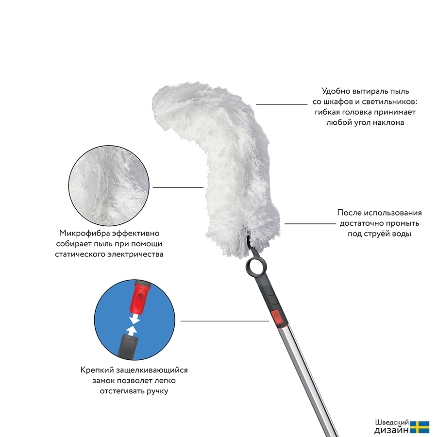 Набор Мультишвабра от бренда Nordic Stream, включающий в себя три основания для швабры, насадку и телескопическую ручку, поможет осуществить быструю и эффективную уборку, сбережет ваши силы и сэкономит время. Гибкая метелка для пыли с насадкой из микрофибры c разделенными волокнами притягивает пыль при помощи электростатической силы, собирает ее, не позволяя подниматься в воздух. Швабра-скребок с прочным пластиковым корпусом, в основе которого зафиксирован сквидж для воды, идеально подходит для уборки в ванной комнате, на кухне, на террасе или у бассейна. Она отлично удаляет воду и моющие средства даже в стыках напольных покрытий. Сменная насадка из жесткой микрофибры предназначена для интенсивной влажной уборки, эффективно справляется со сложными пятнами и твердой грязью, не царапая пол. Микрофибра подходит для всех типов напольных покрытий: кафеля, керамогранита, ламината, дерева и линолеума. Насадки надежно крепятся на флаундере, что препятствует их соскальзыванию в процессе уборки. Микрофибра выдерживает до 300 стирок при температуре до 60?. Съемное основание, изменяющее уровень наклона швабры, и телескопическая ручка облегчат уборку в труднодоступных местах. Ручка снабжена удобным механизмом, который фиксирует две его части в раздвижном положении, препятствуя самопроизвольному сложению. Аксессуар дополнен пластиковым колпачком с кольцом для подвешивания.