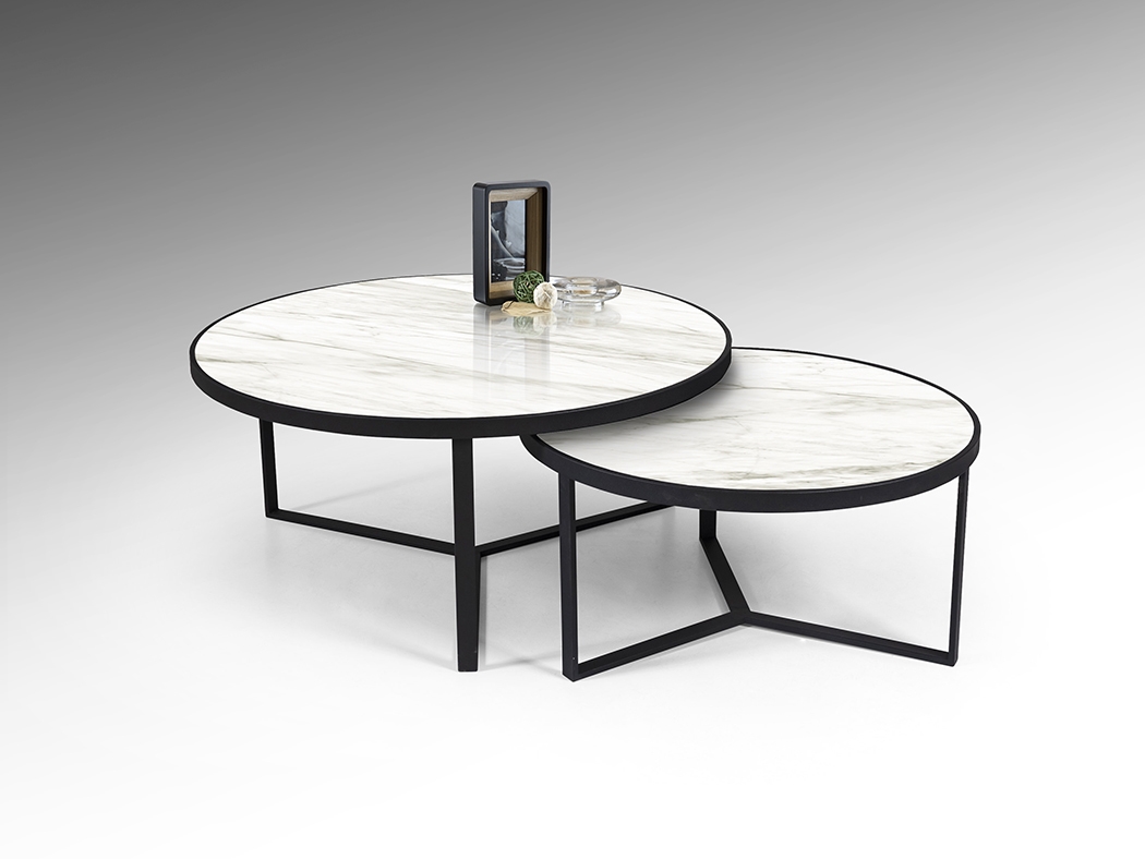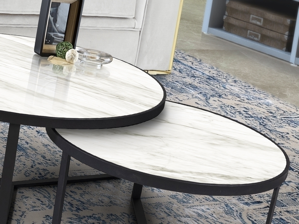 Комплект приставных столиков из металла черного матового цвета. Столешница из МДФ с высокостойкой меламиновой поверхностью и глянцевой отделкой из белого мрамора.