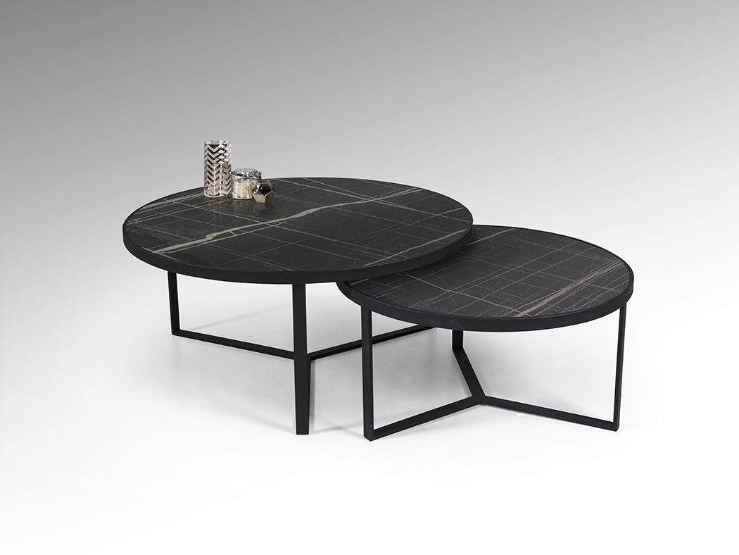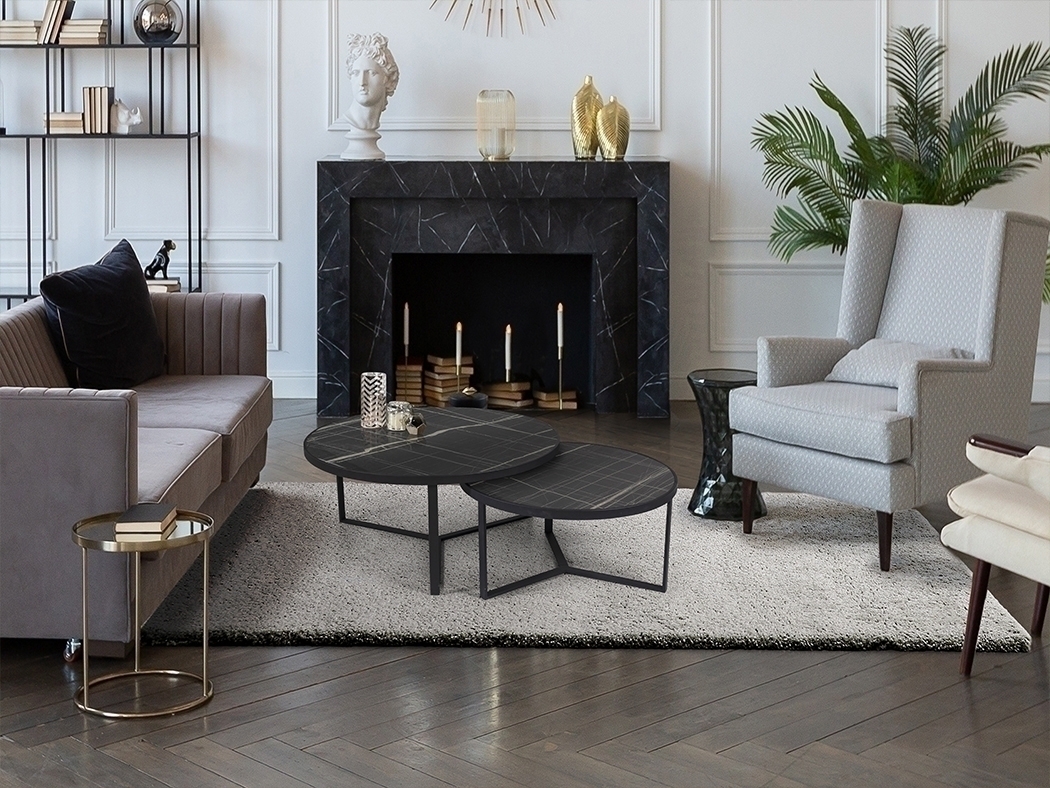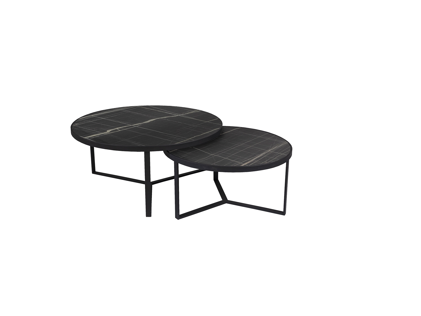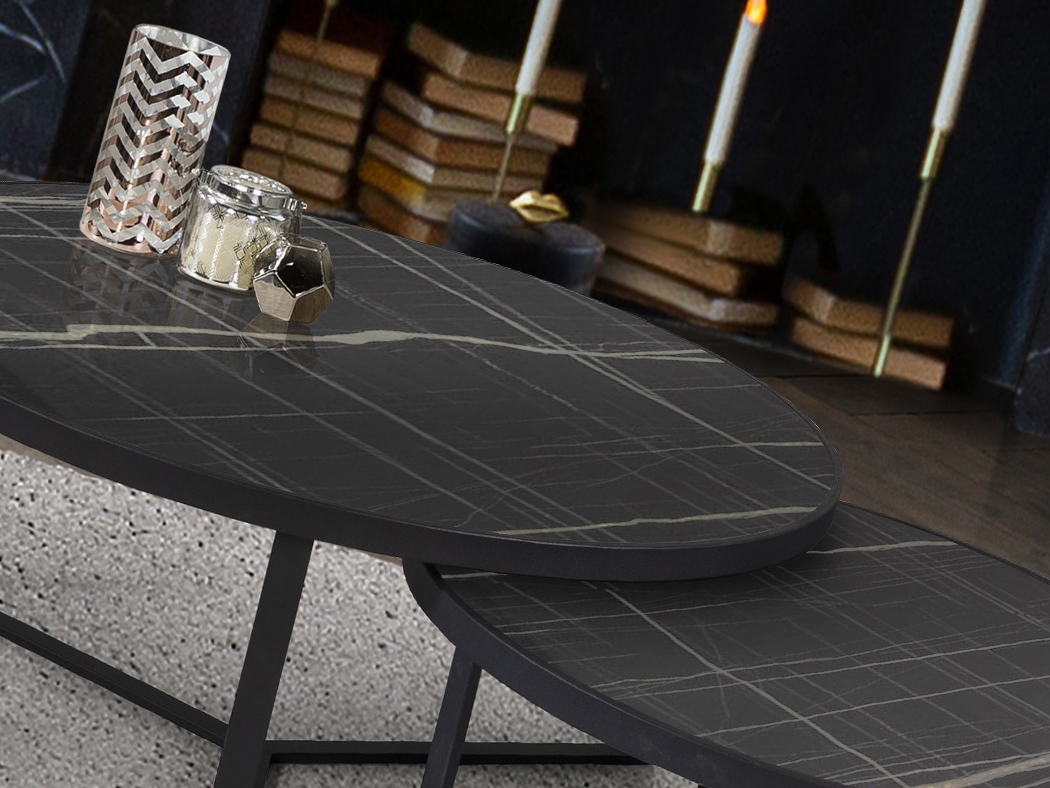 Комплект приставных столиков из металла черного матового цвета. Столешница из МДФ с высокостойкой меламиновой поверхностью и отделкой из глянцевого черного мрамора.