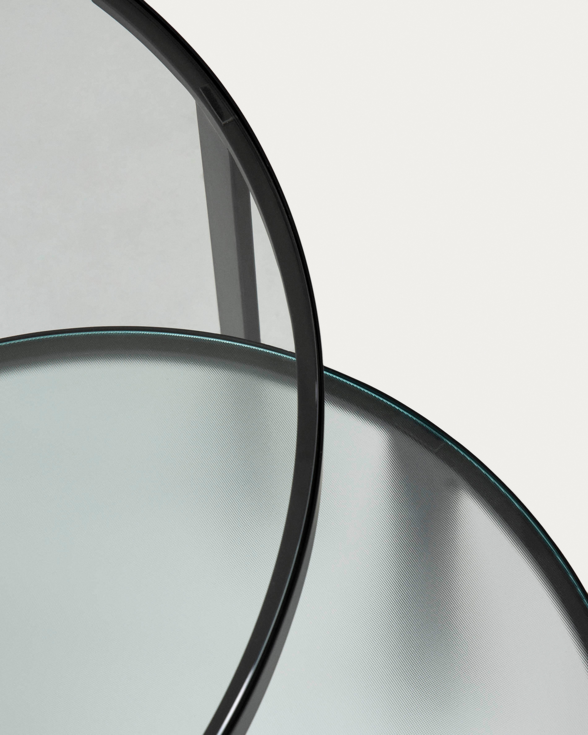 Столики круглой формы. Столешницы выполнены из закаленного стекла толщиной 6 мм. Большой стол оснащен прозрачной столешницей, а малый – матовой текстурированной.