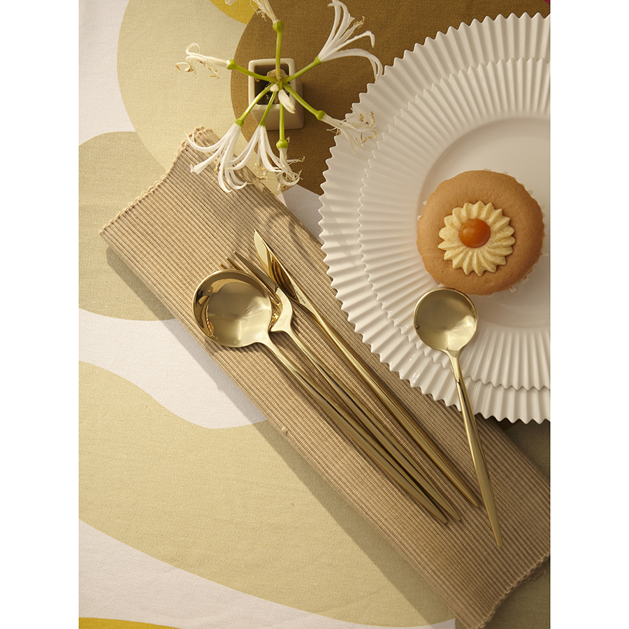 Материалы: нержавеющая сталь 304 (18/10), нержавеющая сталь 13/0. Длина ножа: 22,5 см. Вес ножа: 61 г. Длина вилки: 22 см. Вес вилки: 69 г. Длина ложки: 21,5 см. Вес ложки: 84 г. Длина чайной ложки: 16 см. Вес чайной ложки: 40 г.  Цвет: золотистый. Количество предметов в наборе: 16 шт.