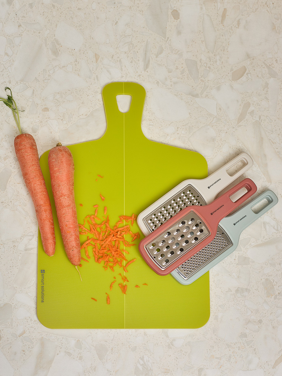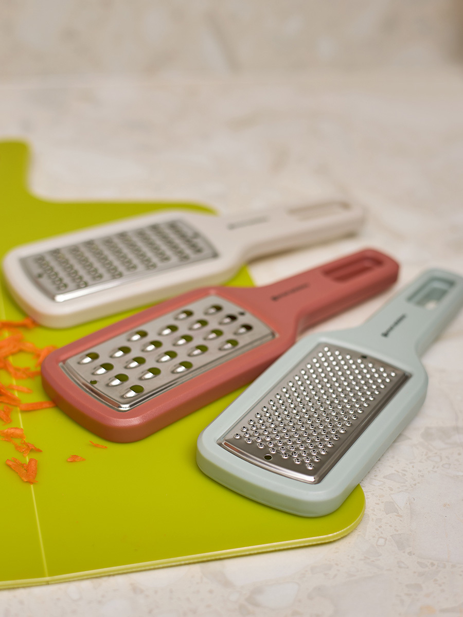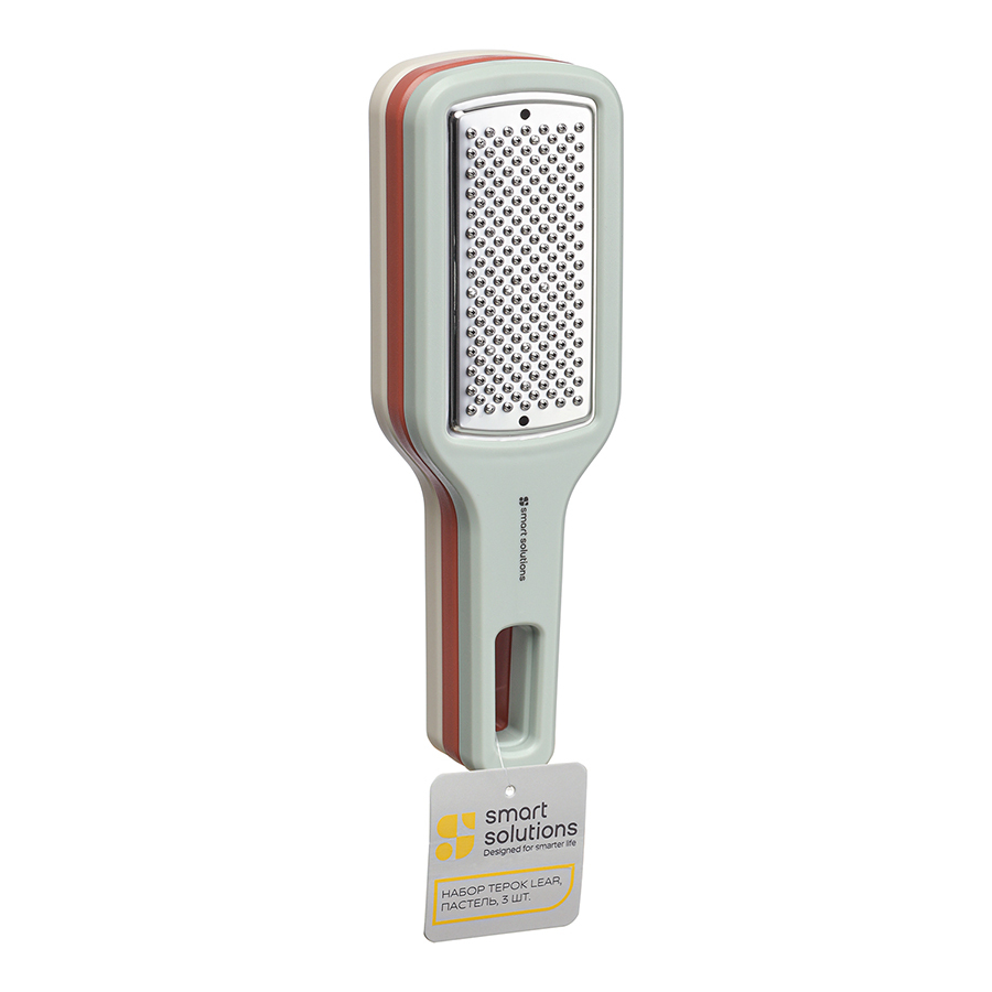 Набор Lear включает три терки: с крупными, мелкими отверстиями и лезвием для получения пюре. Терка с крупными отверстиями идеально подходит для овощей, фруктов и сыра, с мелкими – для сыров твердых пород, овощей. Последняя позволяет получить перетертые в пюре овощи и фрукты.