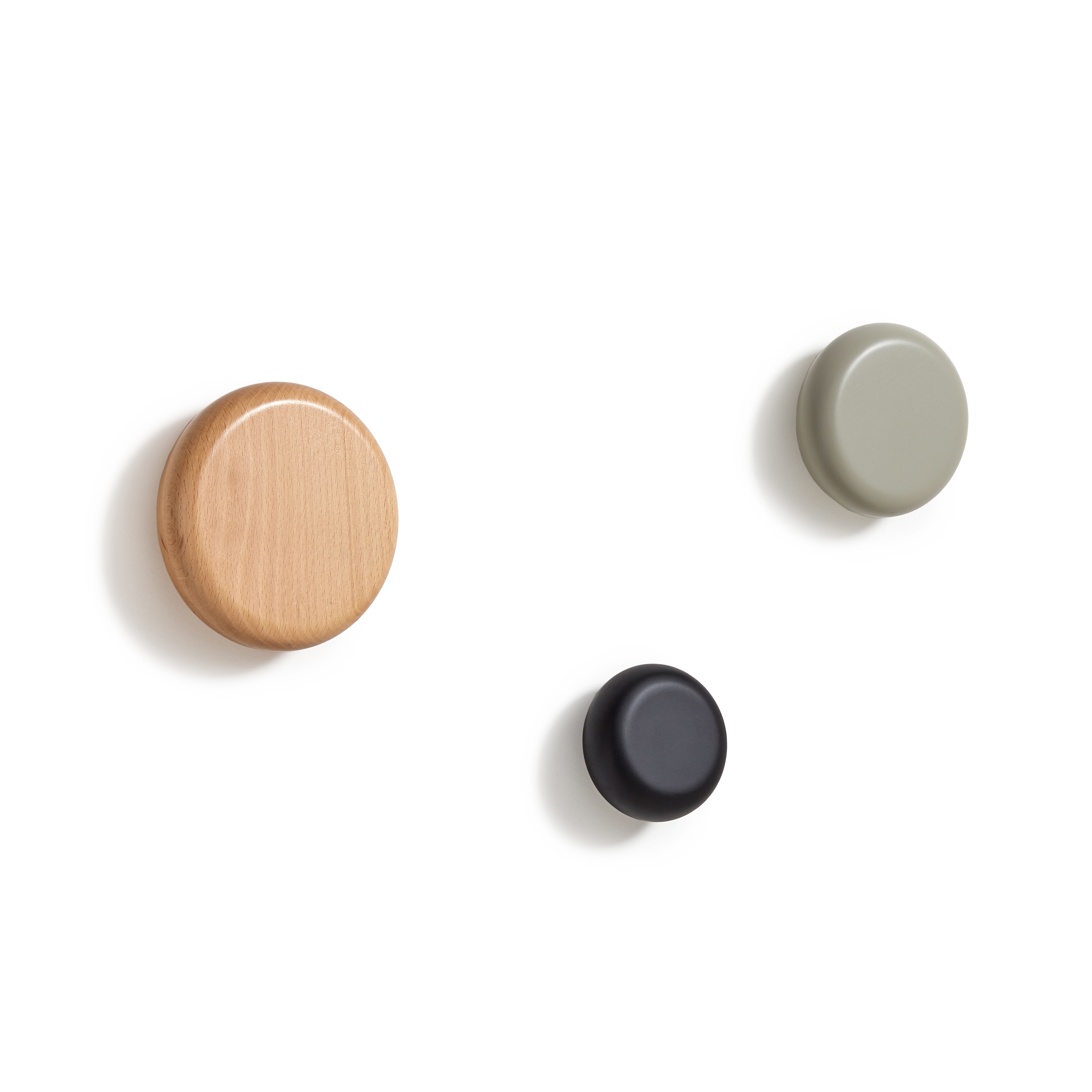Набор состоит из трех круглых крючков разного диаметра. Материал изготовления – древесина бука в натуральной отделке. Сверху есть полиуретановое прозрачное покрытие, которое защищает массив от истирания.