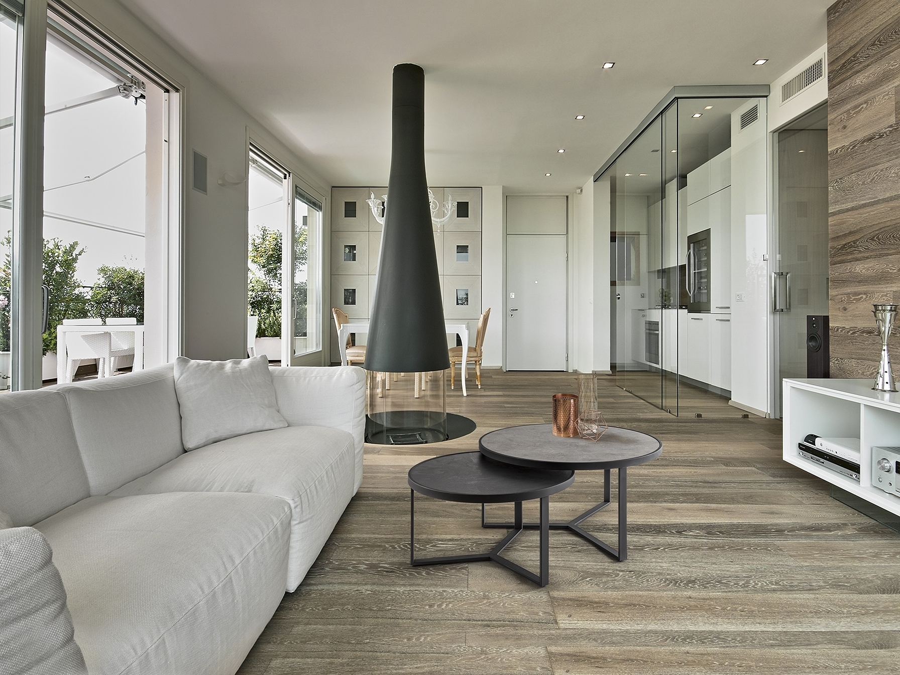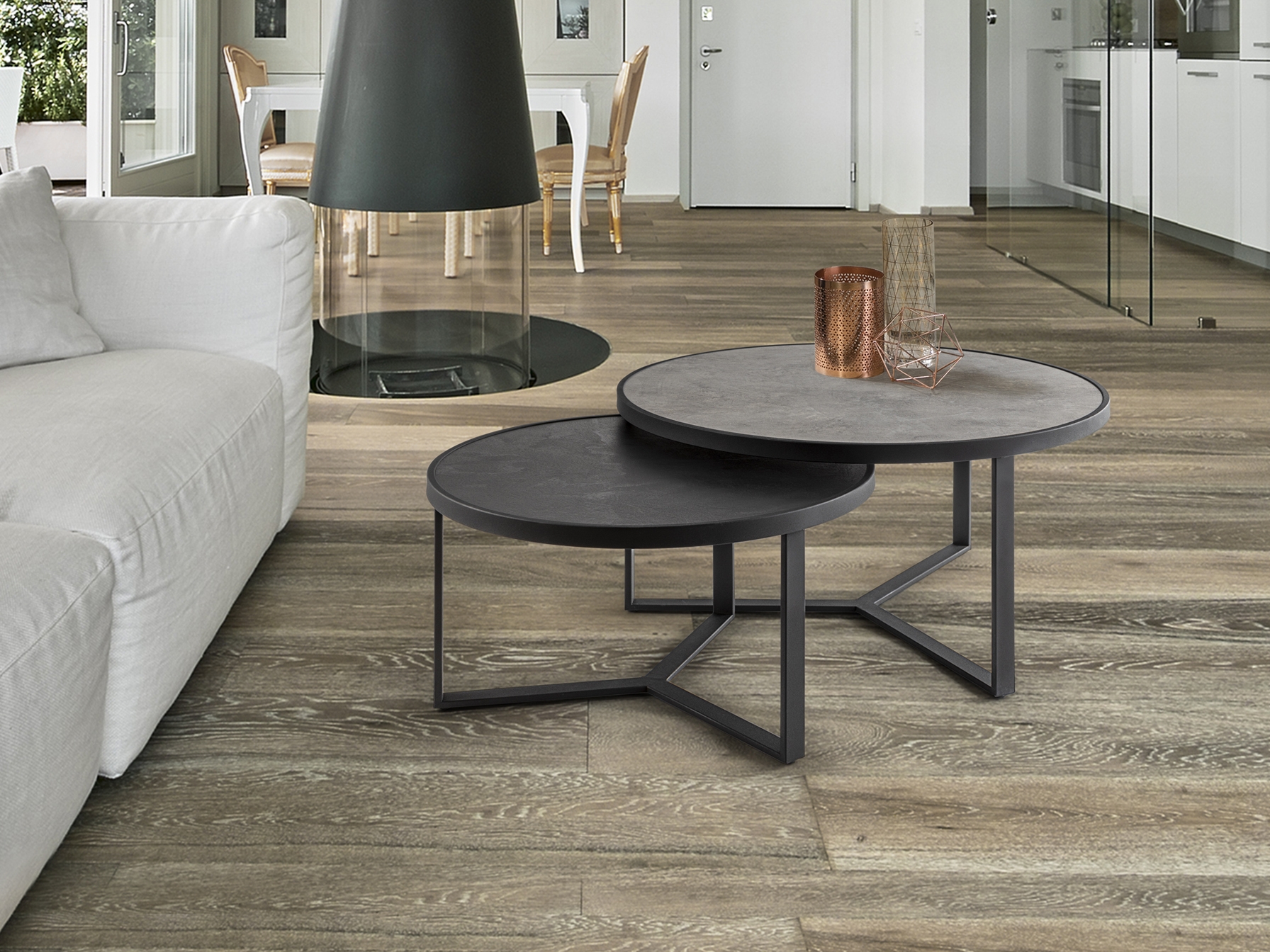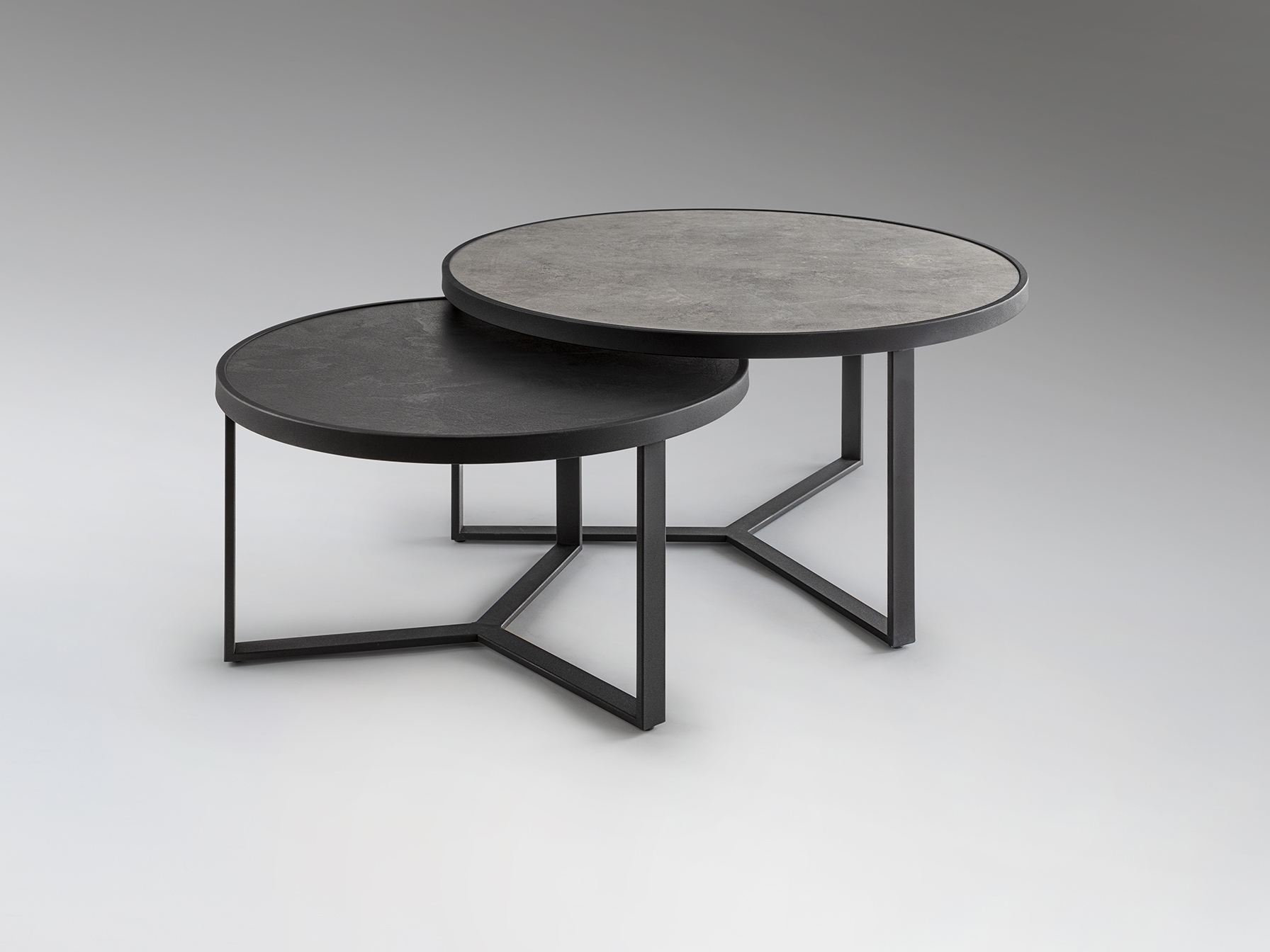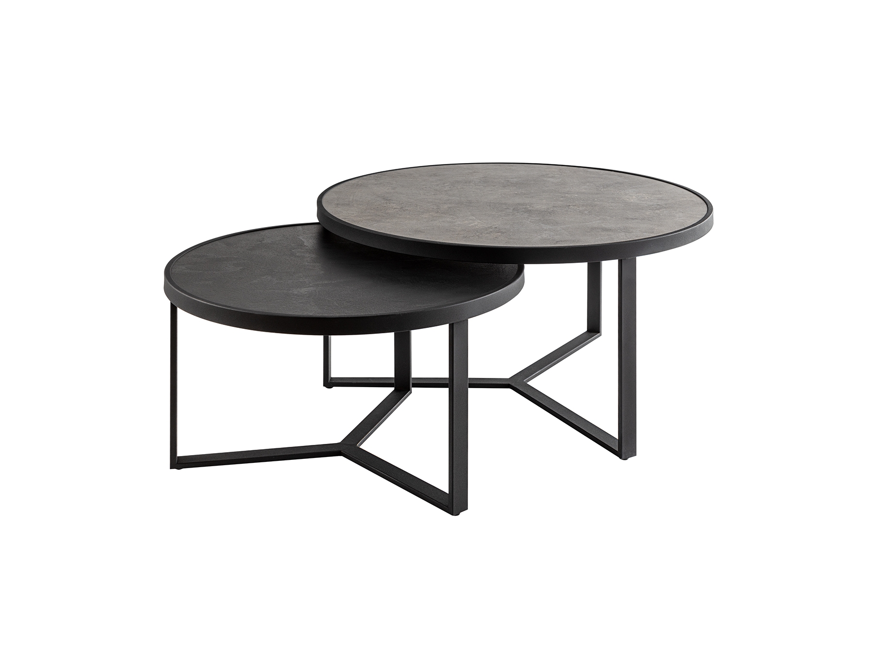 Набор небольших приставных столиков из металла черного матового цвета. Столешница из МДФ с высокостойкой меламиновой поверхностью, отделка серым и черным камнем.