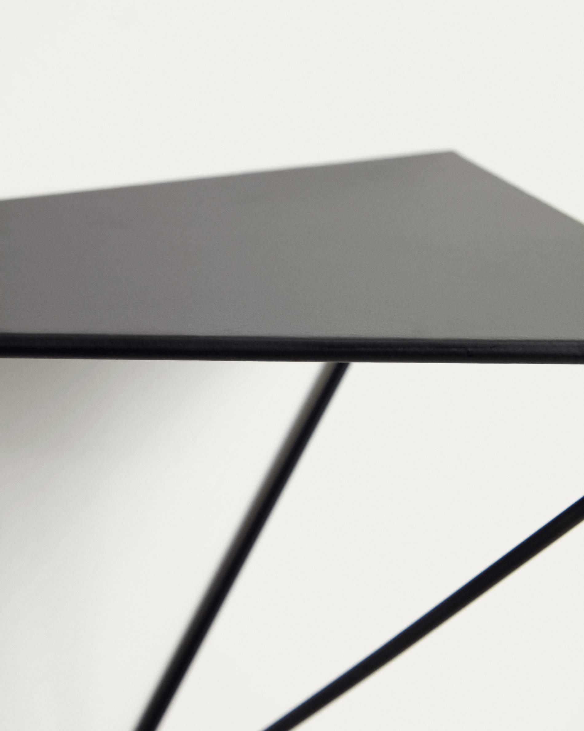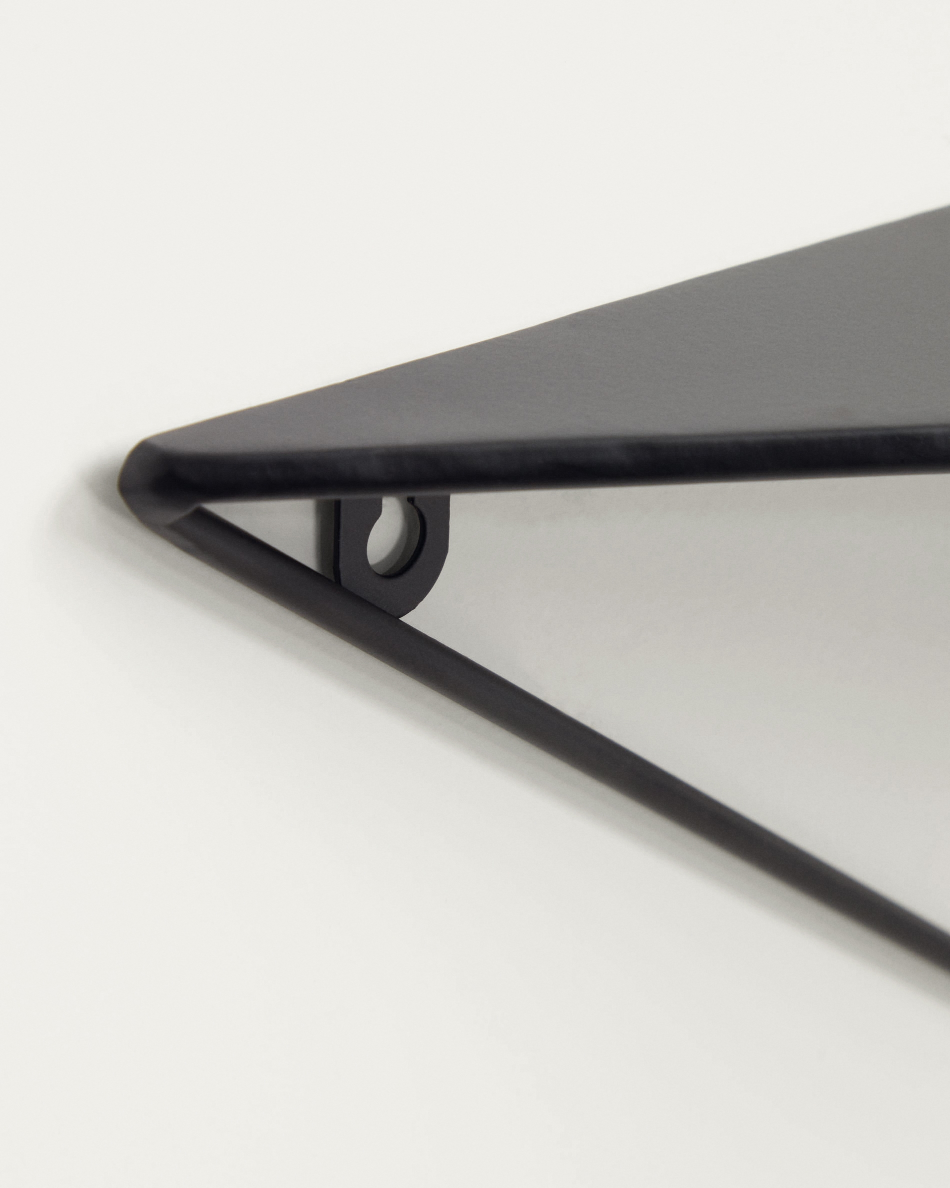 Полка полностью металлическая, окрашена в черный цвет матовой порошковой краской. Ее конструкция состоит из непосредственно самой полки и отходящих от нее направляющих. За счет них, создается эффект 3D, который усиливает визуальный эффект.