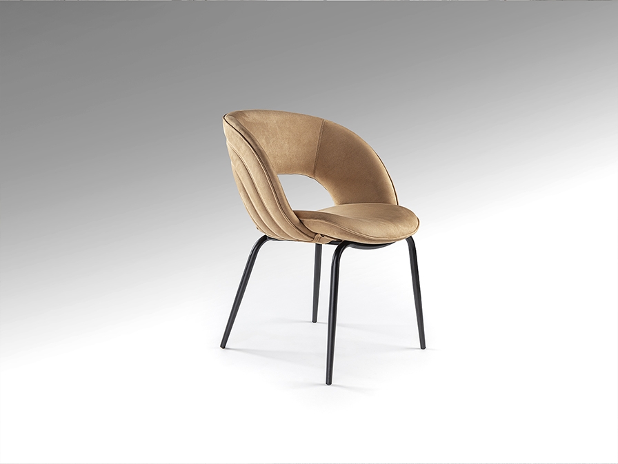 Стул из металла и изогнутой фанеры. Металлические ножки с черной отделкой и обивкой под замшу верблюжьего оттенка.
