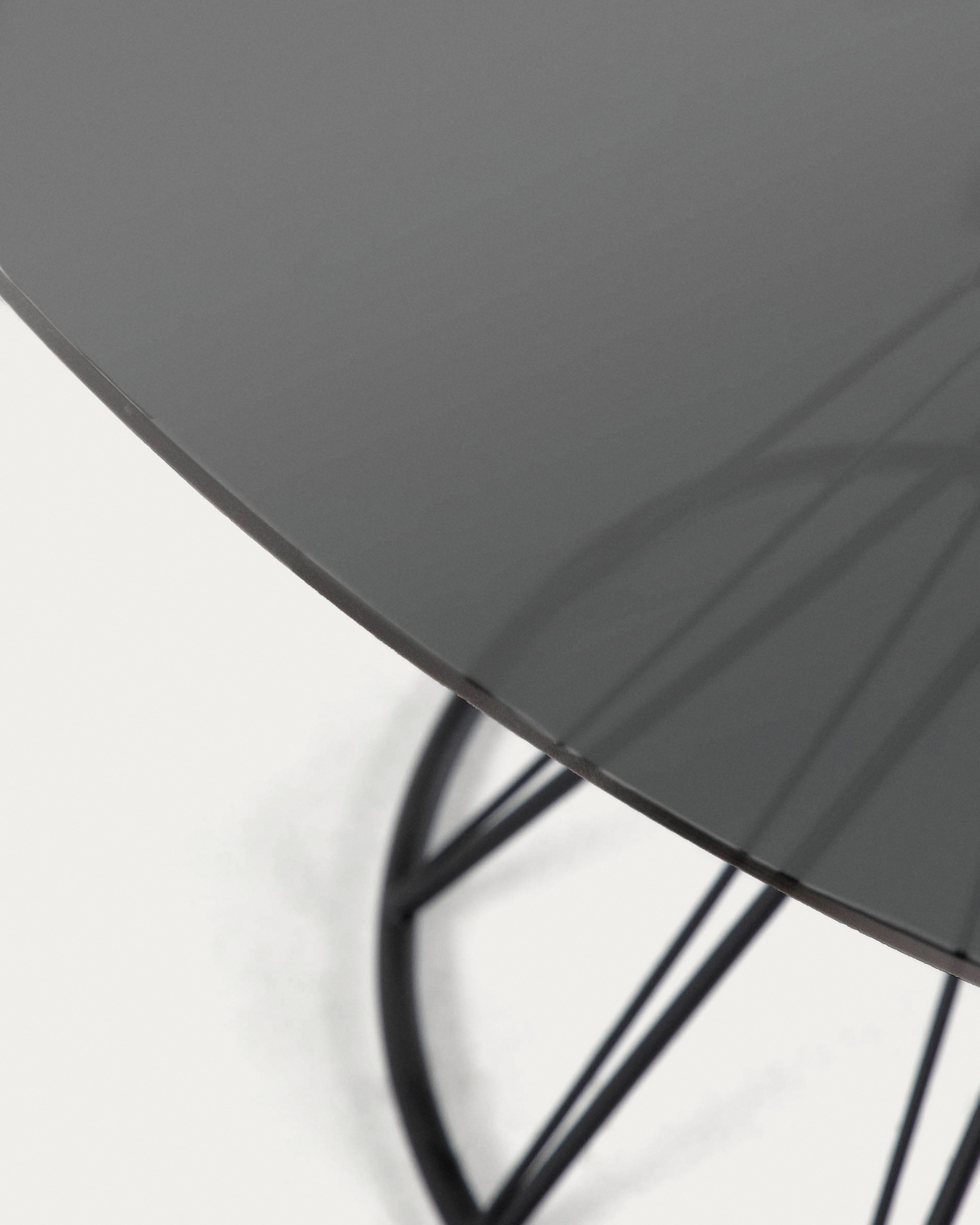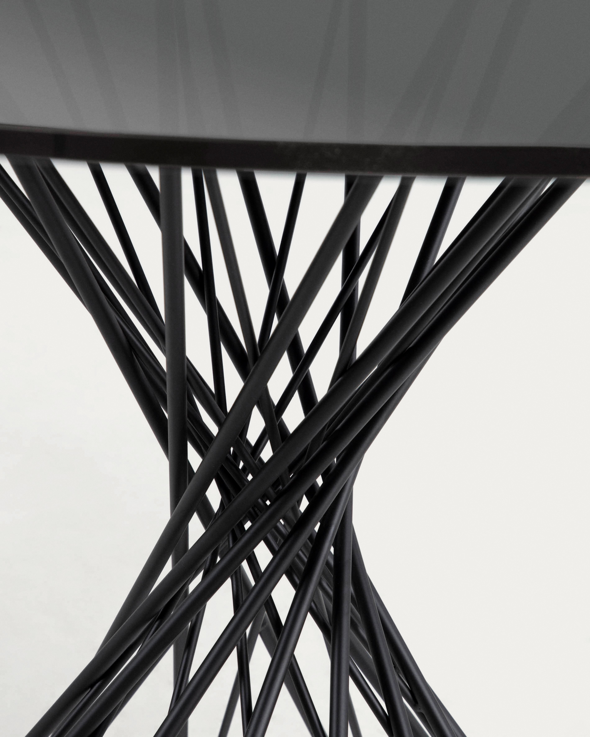 Стол выглядит ярко, эффектно, по-дизайнерски смело. Первое, что надолго задерживает взгляд, это стойка. Она настолько мастерски закручена, что даже не верится в ее исключительную стальную прочность. Матовое черное стекло завораживает. Оно придает изделию некий шарм и полную гармонию с общей концепцией.