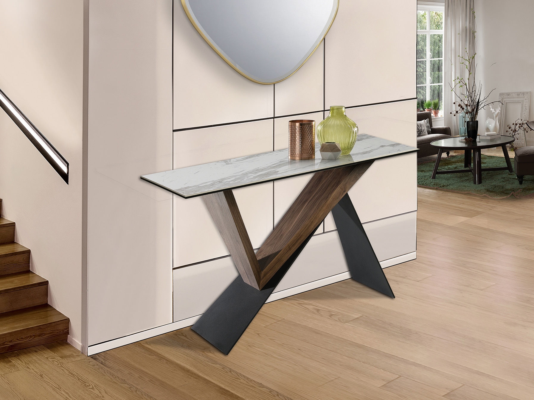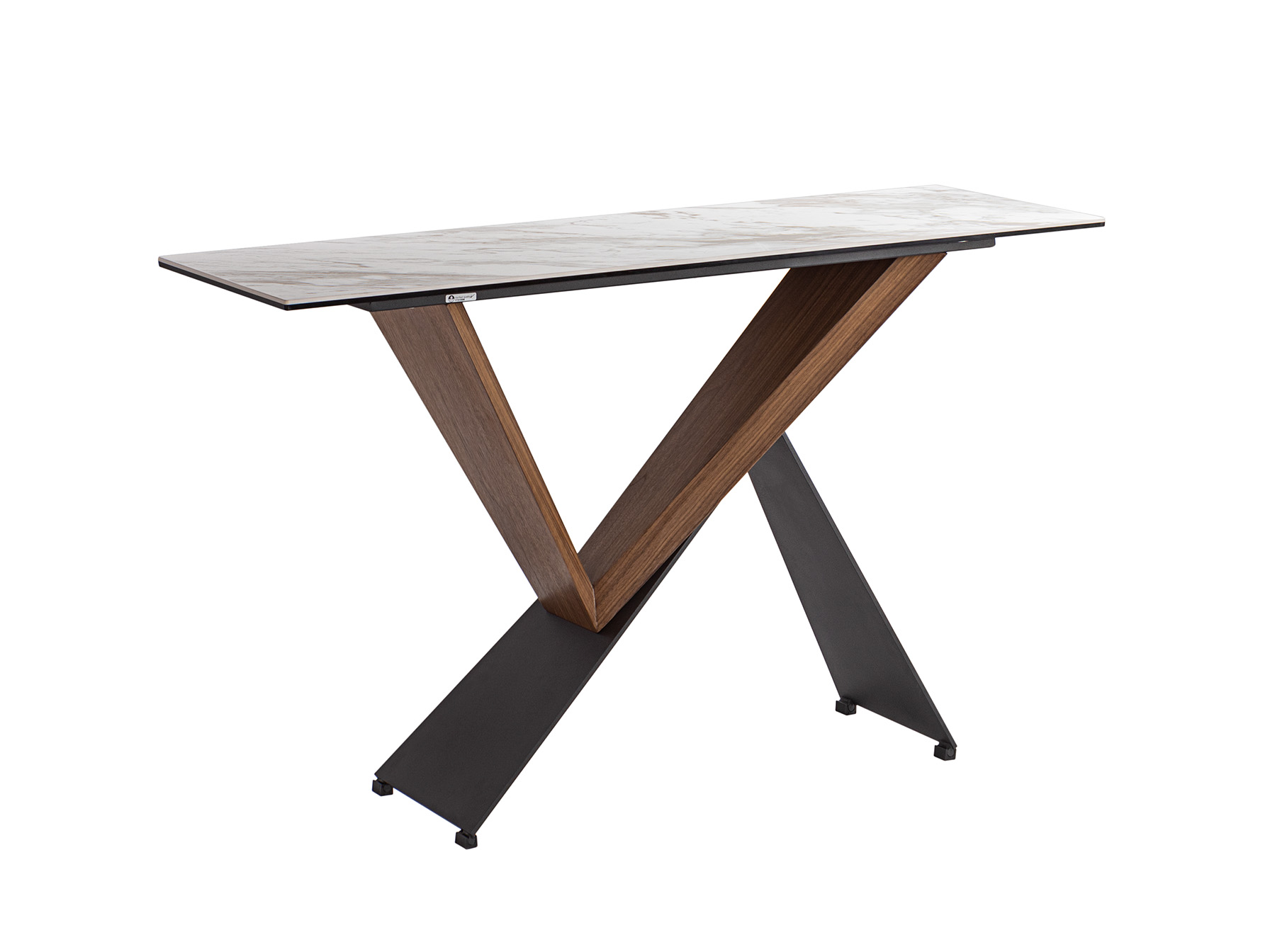 Консольный столик из металла, покрытого матовым черным лаком, и орехового дерева. Ламинированная столешница из фарфора и стекла с декором из белого мрамора в глянцевой отделке.